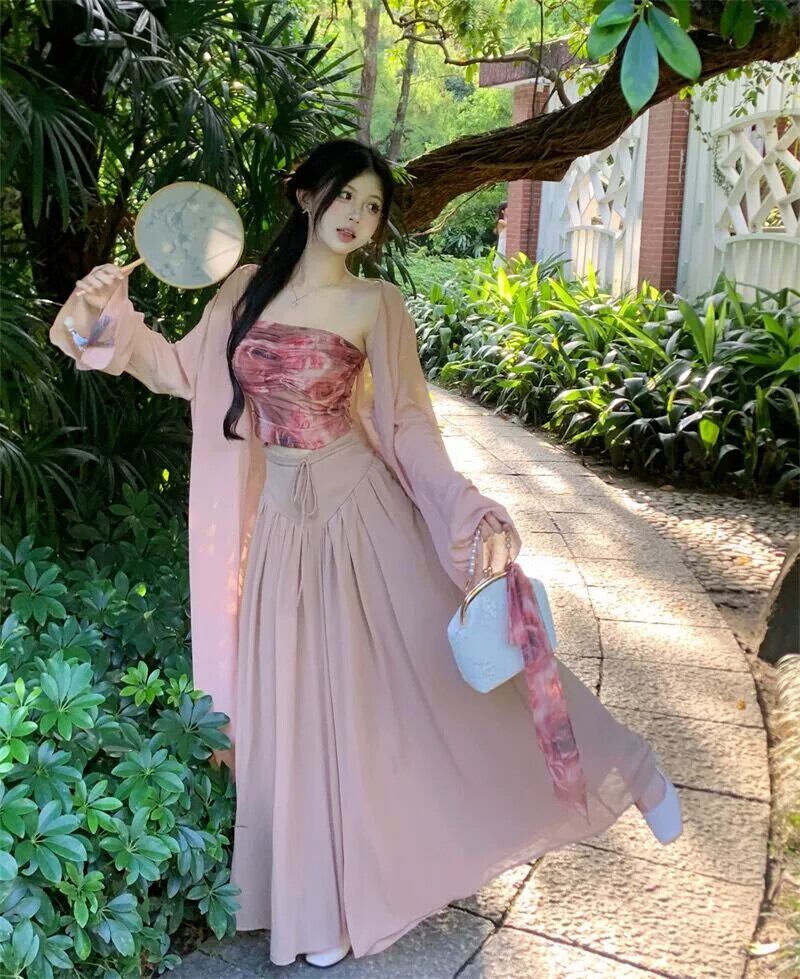 色:ローズチューブトップ,カーディガン,垂れ下がったズボン