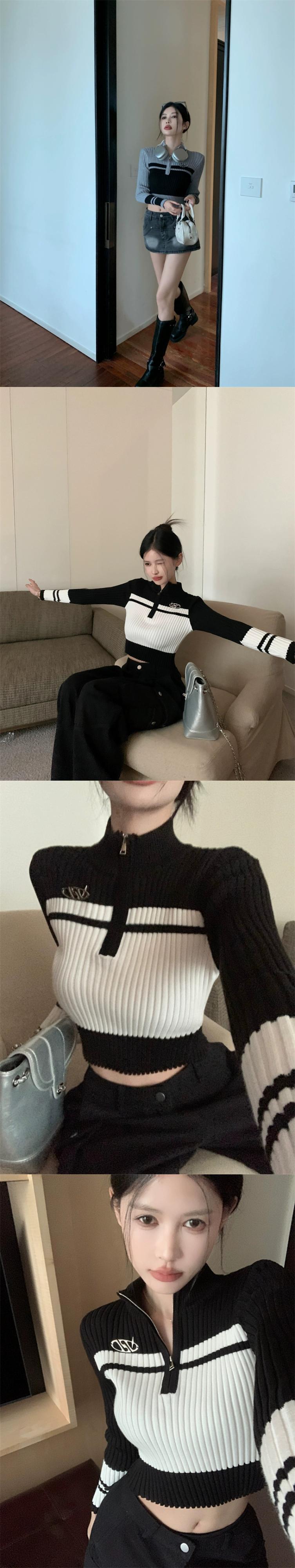 アメリカのハイカラーコントラストカラー長袖セーター女性初秋 2023 新しいショートスリムスリムセーターイン ロング オータム 秋物 0921914468530892
