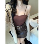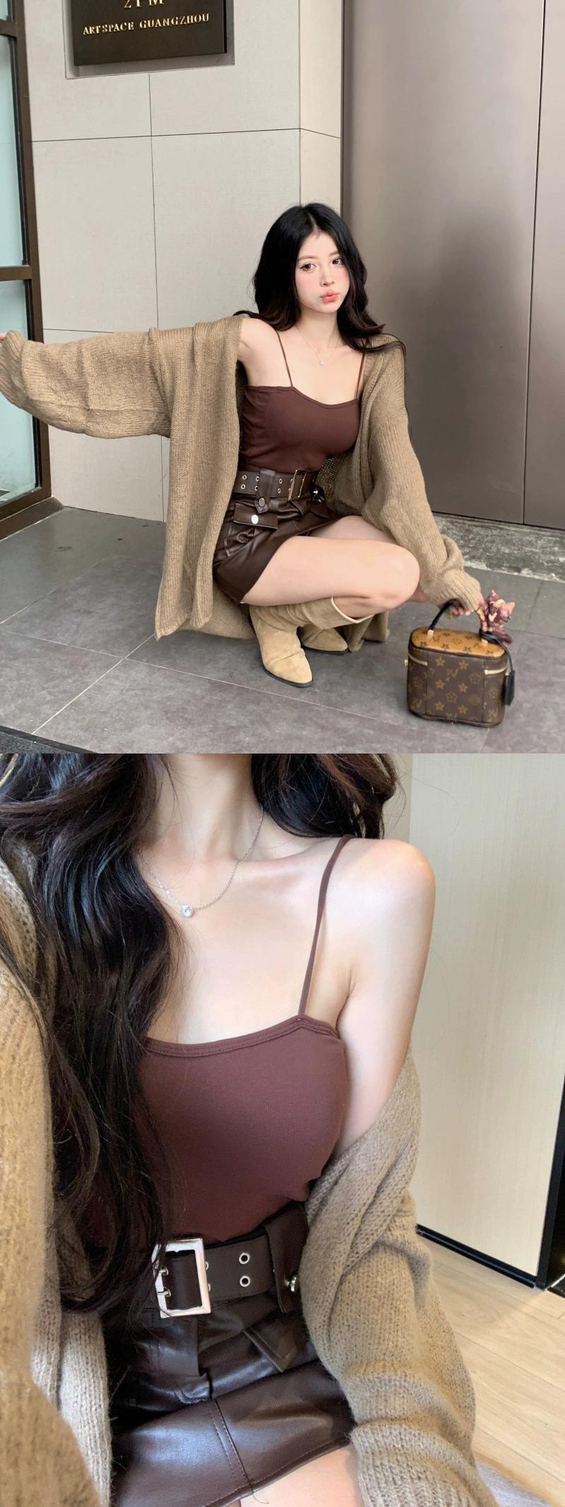 色:クリームアプリコットセーターカーディガン,ウォームラテセーターカーディガン,ブラウンスリング,ブラウンレザースカート