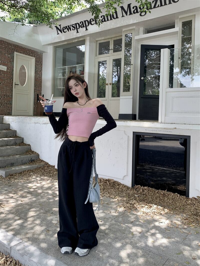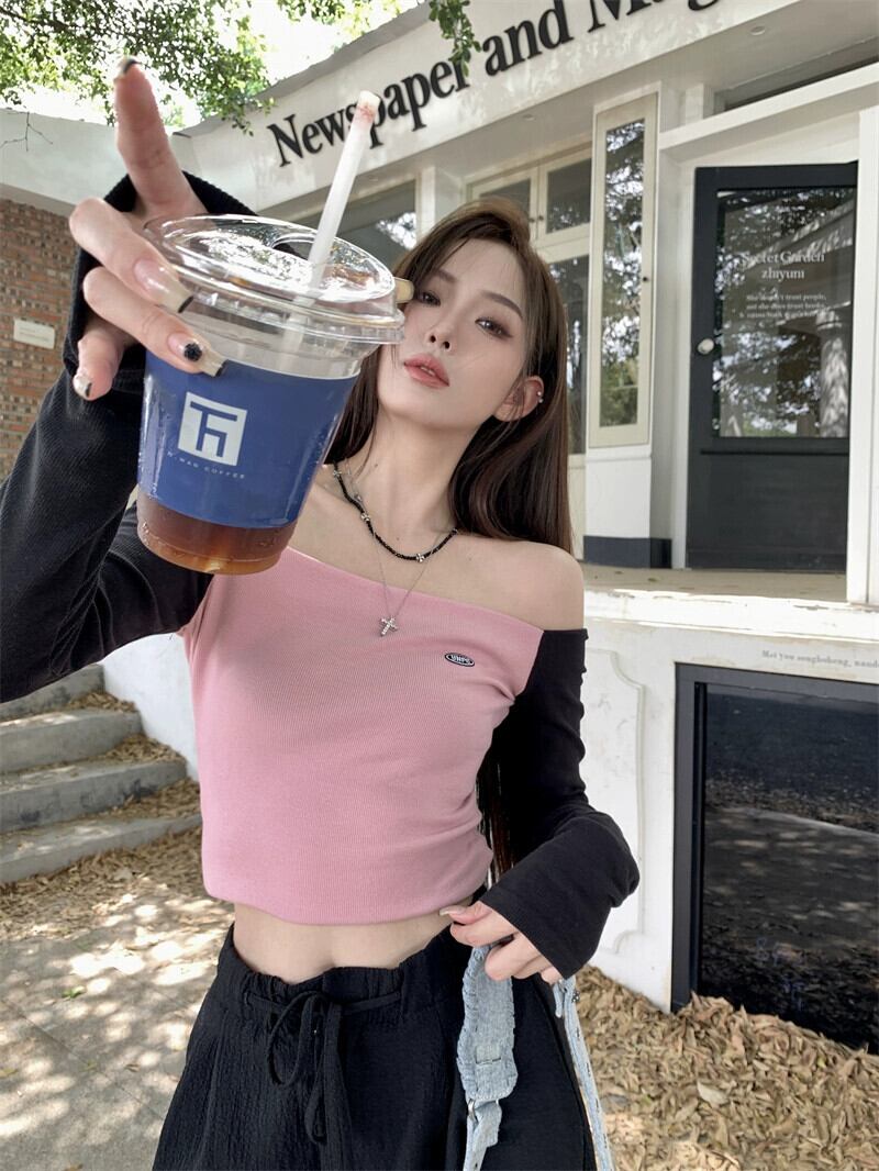 スプライスピンクワンショルダーニット長袖Tシャツ女性初秋2023新しいスタイルの気質ショートスリムフィットトップ ロング オータム 秋物 0921968371031227