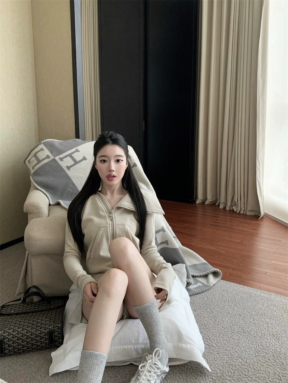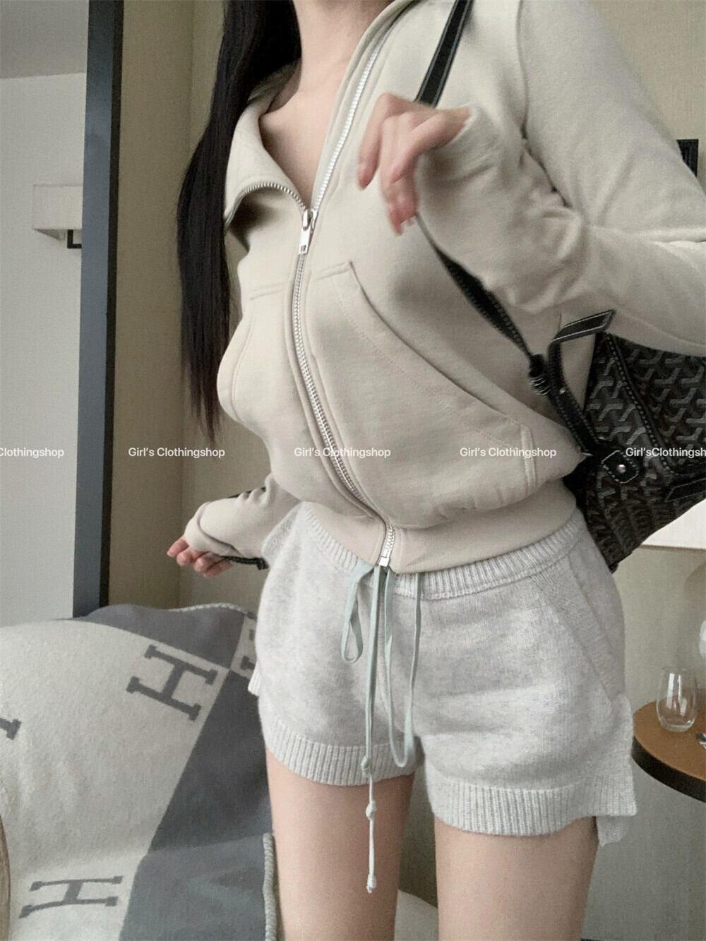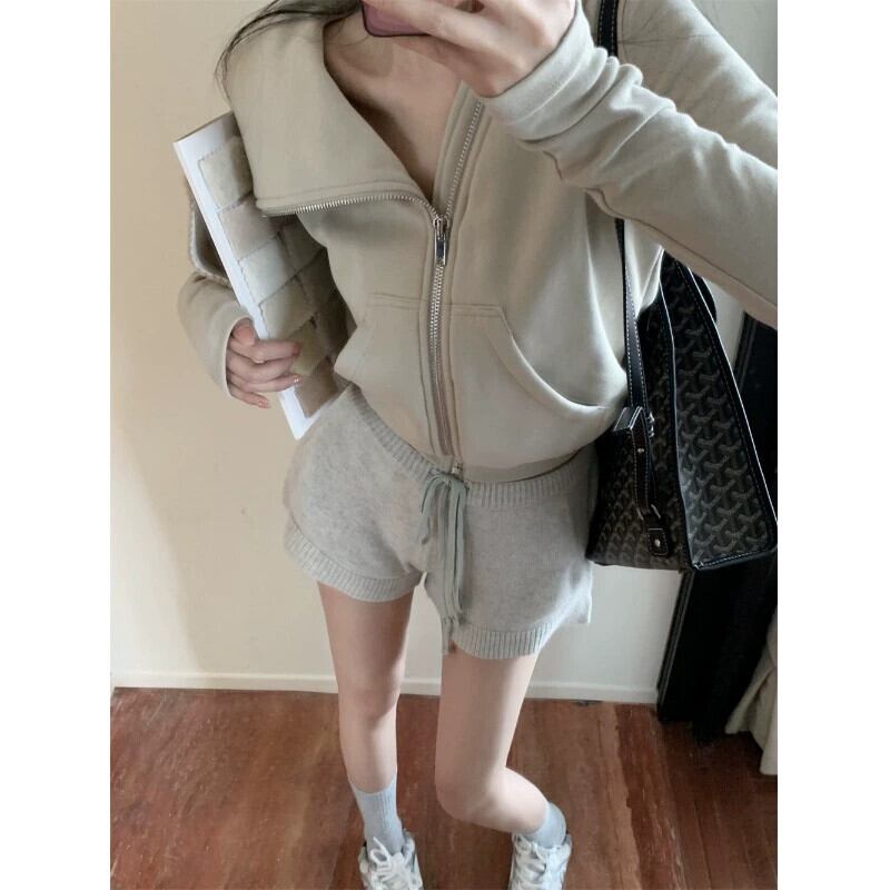 スタイルオールマッチファッションスーツ女性秋 2023 新しいラペルジッパー長袖ジャケットニットショーツ 2 点セット ロング オータム 秋物 ブルマー 0921924847843375
