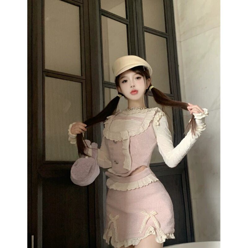 純粋な欲望の恋人ホットガールスタイルの 3 点セット女性秋 2023 スタイルのレースのベスト底シャツスカートスーツ 大人ガーリー スウィート キュート カジュアル オータム 秋物 0921999592494606