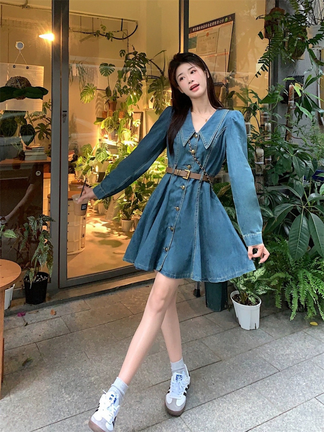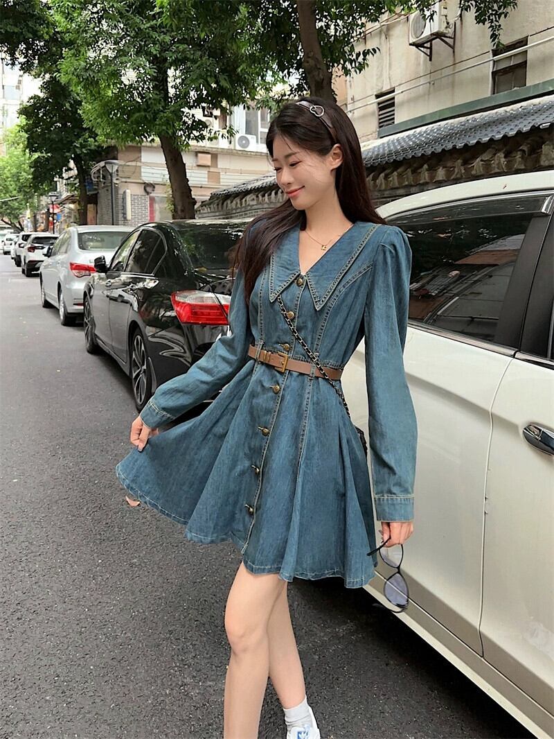 フレンチレトロ V ネック長袖デニムドレスの女性の 2023 秋の新しいスタイルの気質ウエスト痩身 A ラインスカート ロング オータム 秋物 Vネック Aライン 0921913971047660