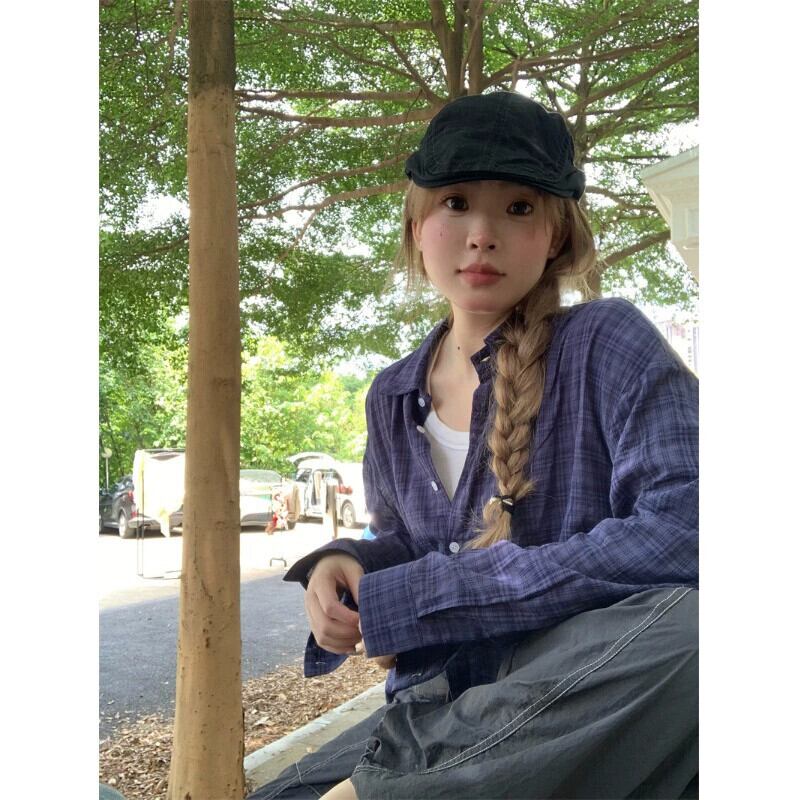 レトロブルーチェック柄ストライプ長袖シャツ女性初秋 2023 新しいミッドレングスルーズでスリムなカーディガンシャツ ロング オータム 秋物 092193423850397
