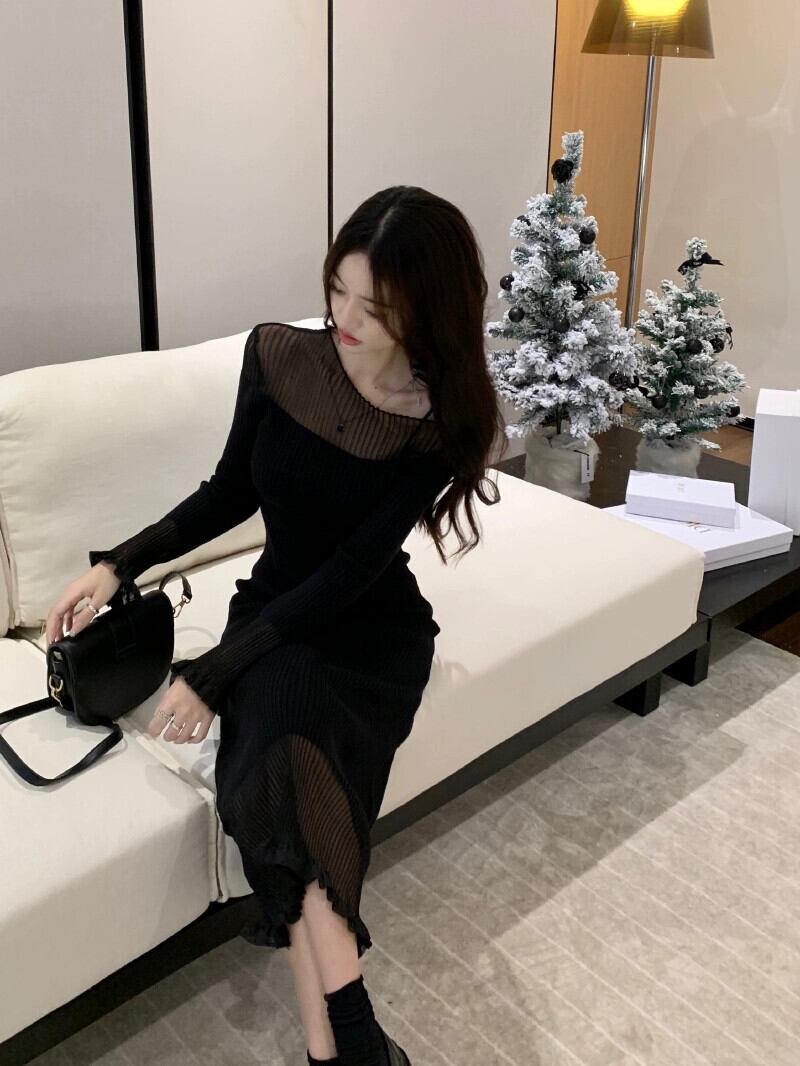 ed メッシュスプライシングニットドレス女性秋 2023 新しいベル袖純粋な欲望セクシーなスリムスカート ベルスリーブ オータム 秋物 ピュア 0921989435413416