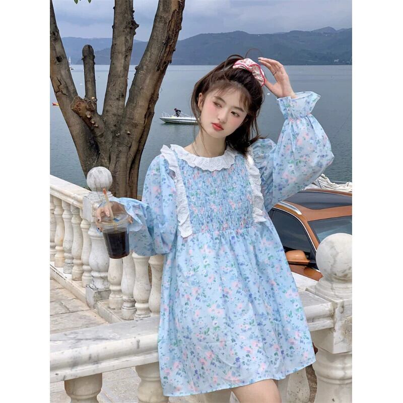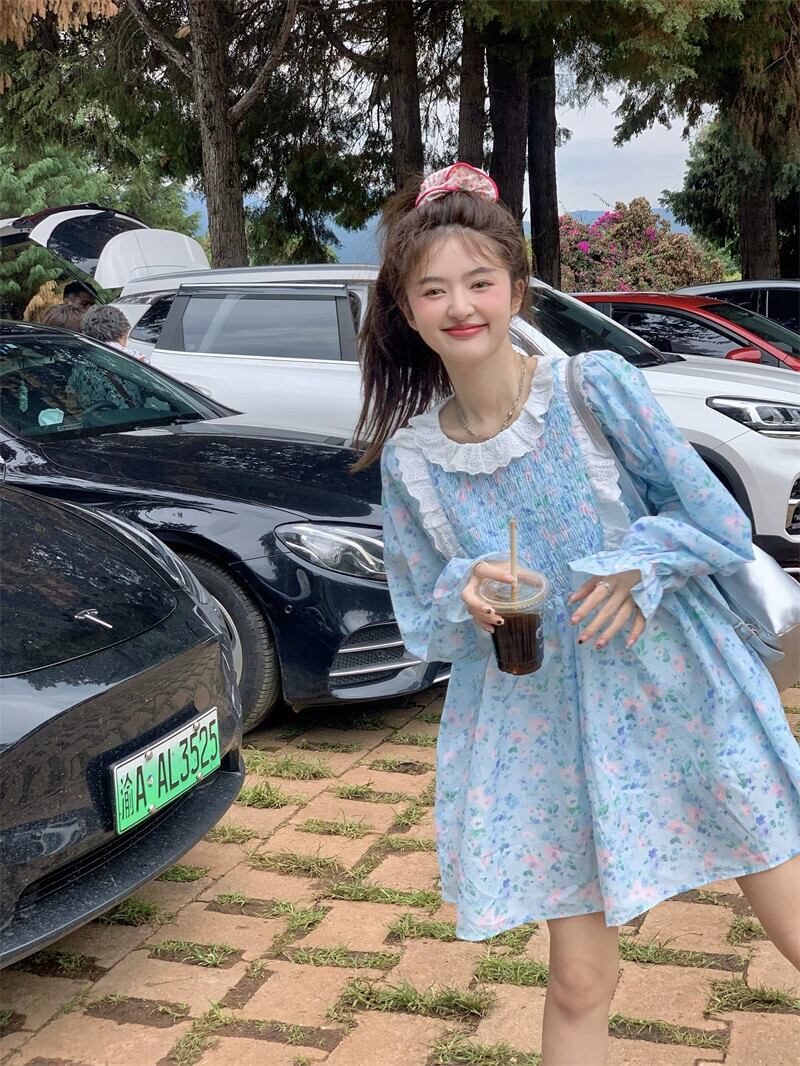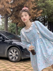 甘いスタイルのレース人形襟花柄スカート女性の秋の長袖スカートルーズ a ラインスリムドレス ロング 大人ガーリー スウィート キュート カジュアル オータム 秋物 Aライン 0921958950086798