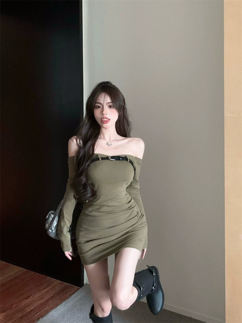 ホットガールスタイルチューブトップ長袖ドレス女性の秋 2023 ワンラインネックスリムフィットヒップカバーボトリングスカート ロング オータム 秋物 0921917634670871