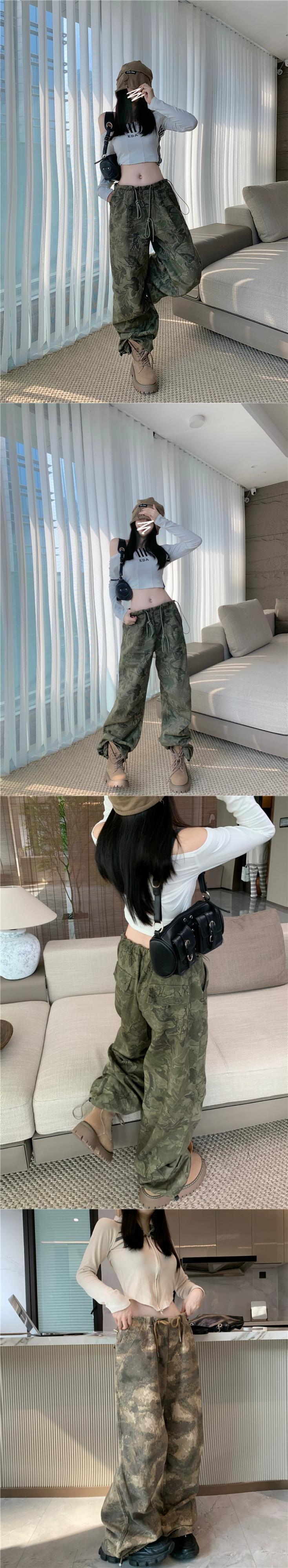 ストリートスタイルアメリカン迷彩ワークパンツ女性の秋 2023 ホットガールストリート巾着ウエストワイドレッグパンツ オータム 秋物 ワイドパンツ 0921973721484147