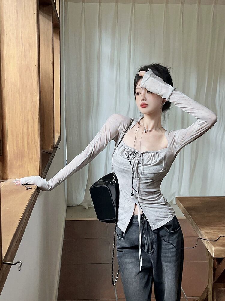 ホット汚れ巾着プリントメッシュ長袖 Tシャツ女性初秋 2023 新しいスタイルショートスリムスリムトップトレンディな ロング オータム 秋物 0921914823347169