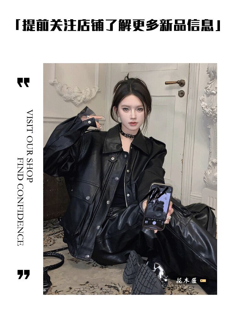 アメリカンレトロ長袖オートバイレザージャケット女性初秋 2023 新しい多用途ルーズスリムカーディガンジャケットトレンディな ロング オータム 秋物 0921935062688393