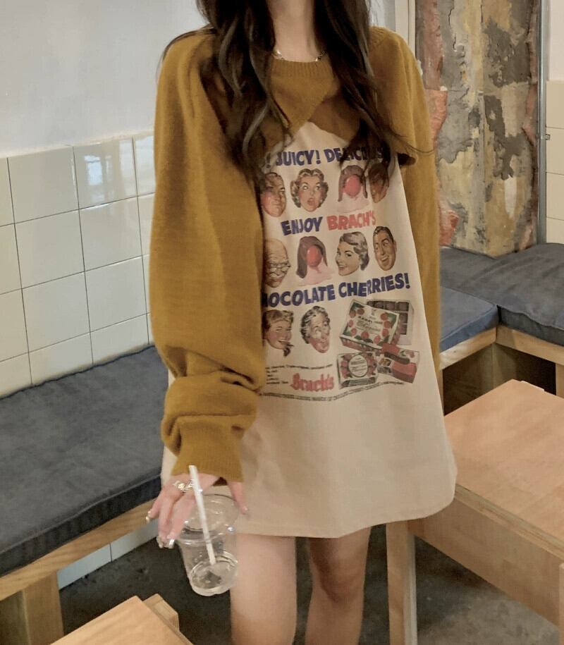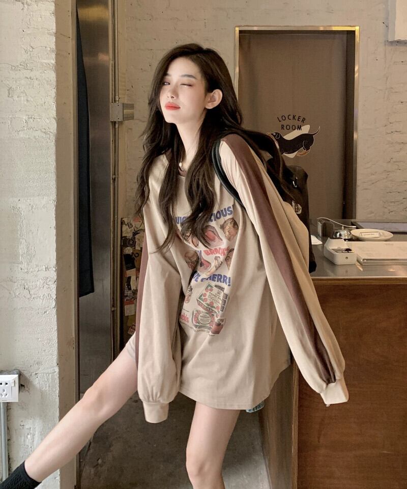 アメリカンファンプリントコントラストカラー長袖 Tシャツ女性秋 2023 新しいスタイルミディアム丈ルーズ痩身多用途トップ ロング オータム 秋物 0921947038282109