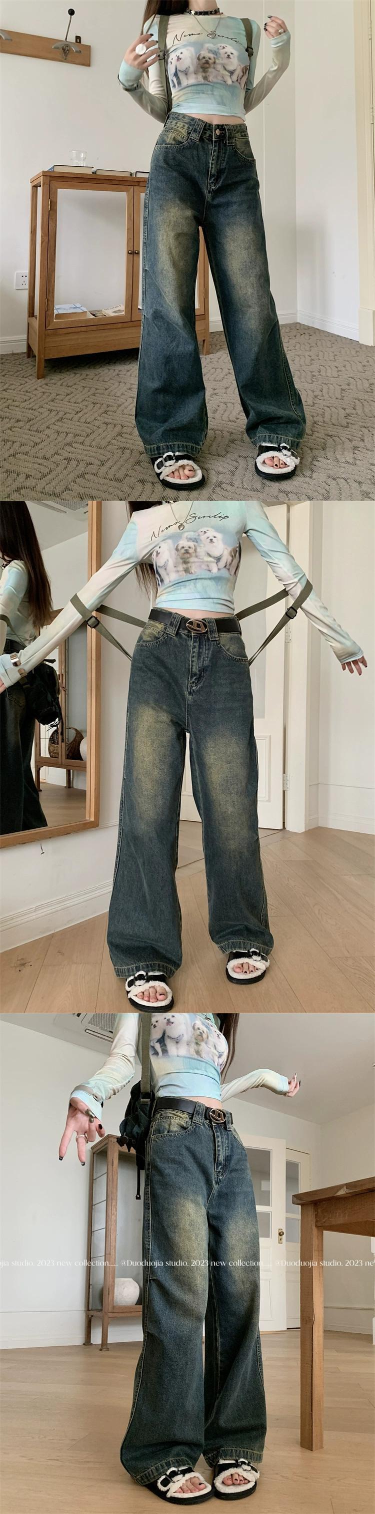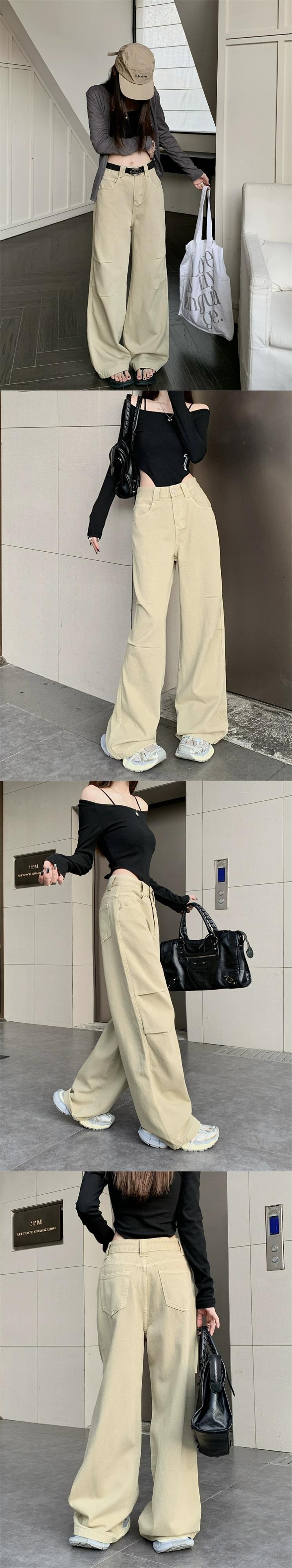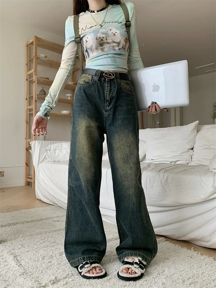 レトロユーズド加工ウエストスリムジーンズ女性の秋 2023 多用途ルーズワイドレッグフロアモップパンツ オータム 秋物 ワイドパンツ 0921971723311391