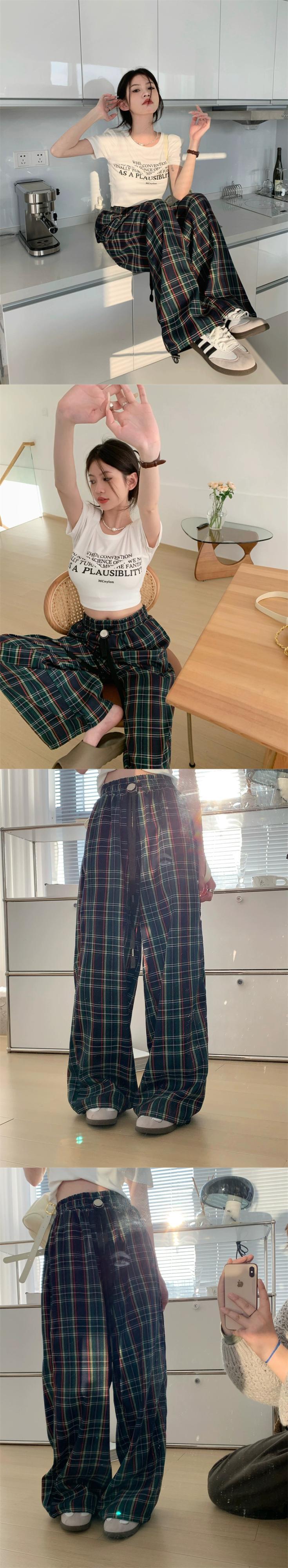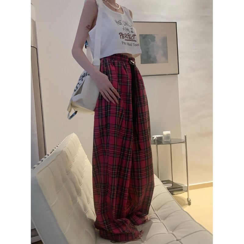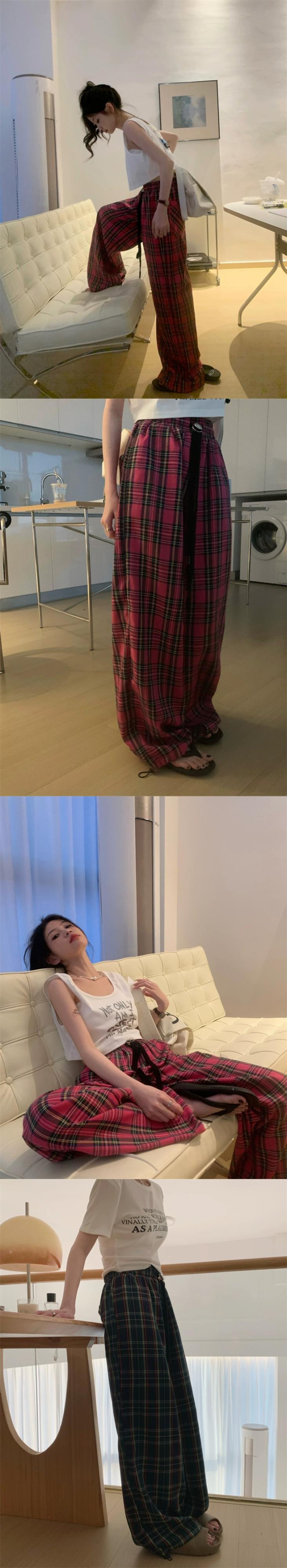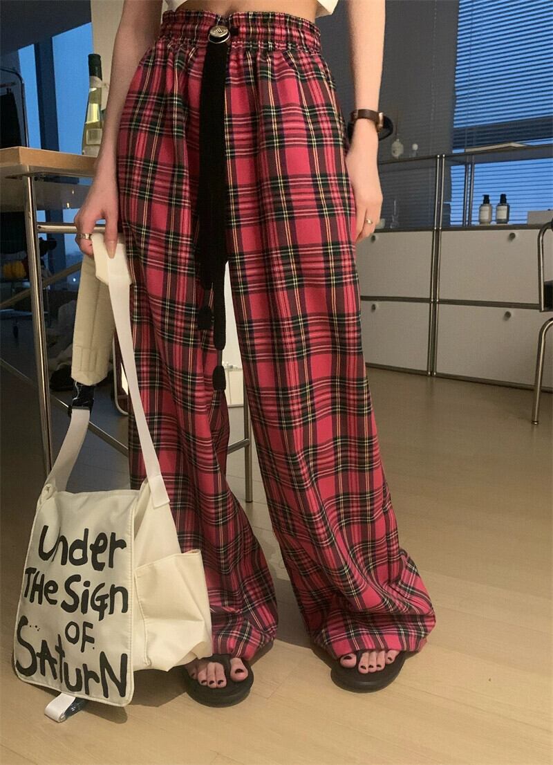 西洋スタイルの巾着カラフルなチェック柄カジュアルパンツ女性初秋 2023 新しい多用途ハイウエストルーズ痩身ワイドレッグパンツ オータム 秋物 0921926584880279