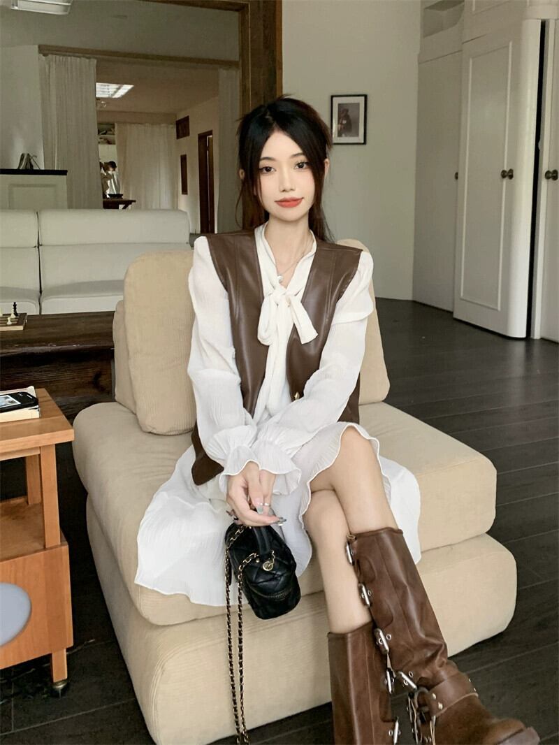 フランスの優しいスーツスカート女性 2023 初秋の新しいレトロブラウンベスト痩身長袖ドレス 2 点セット ロング オータム 秋物 0921923825663598