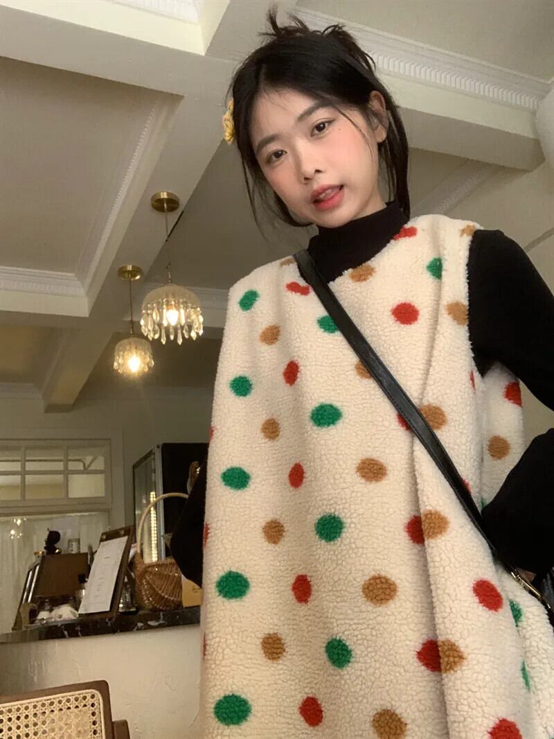 スタイルカラフルな水玉ラムウールベストドレス女性秋レイヤードミッドレングススカートルーズ痩身ノースリーブスカート レッド オータム 秋物 0921995010681326