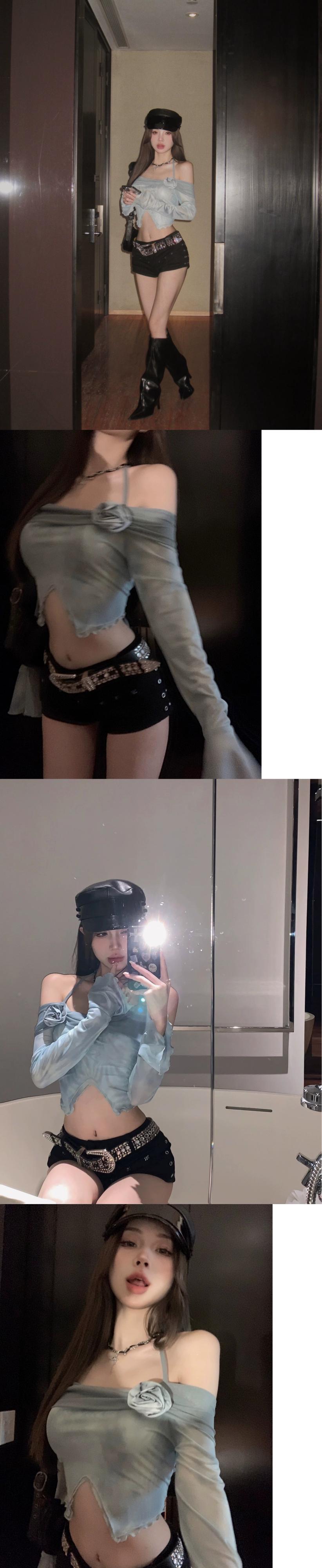 セクシーなワンラインカラー長袖シフォンシャツ女性秋 2023 新しいスタイルの気質ショートスリムスリムトップトレンディ ロング オータム 秋物 0921924034678316