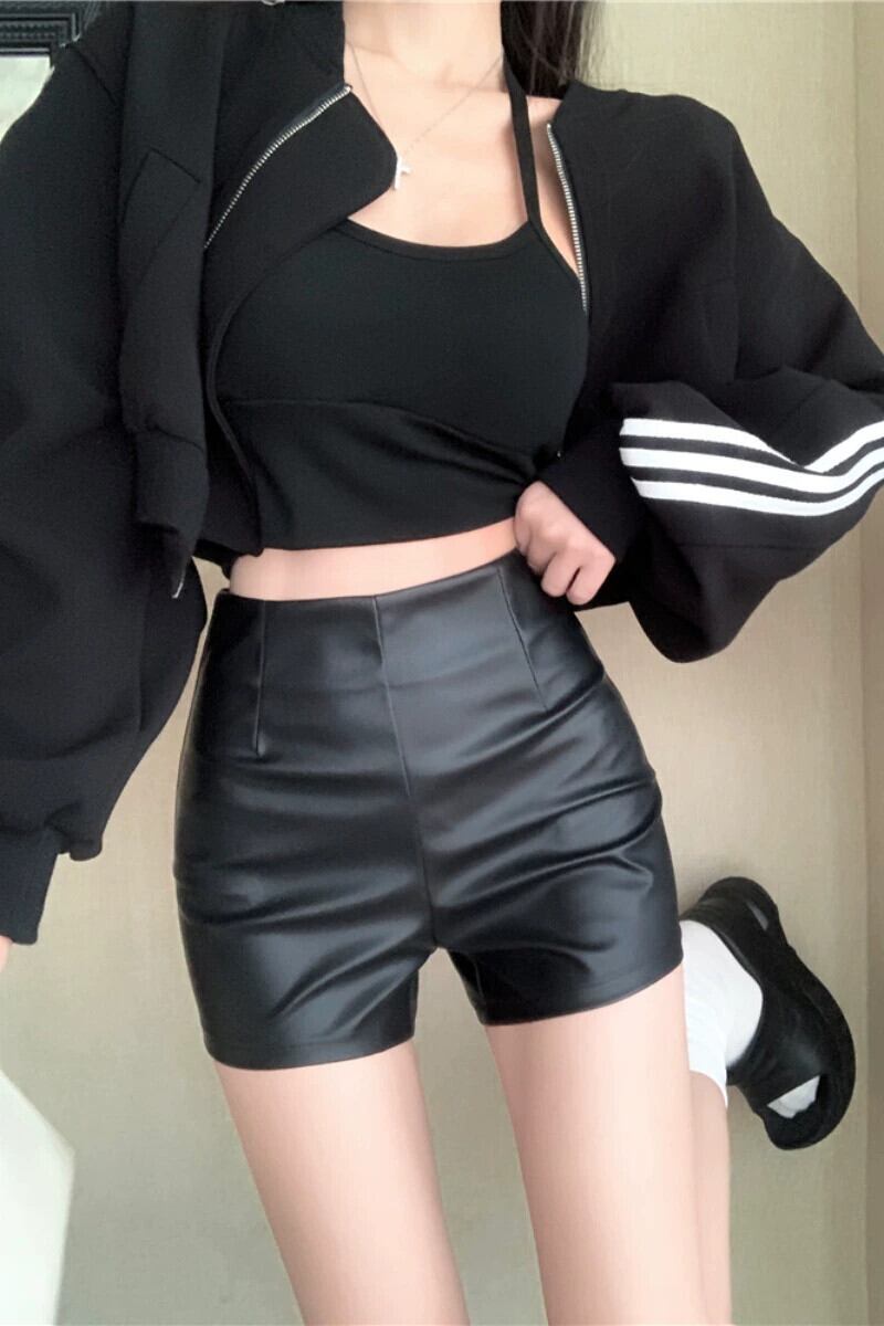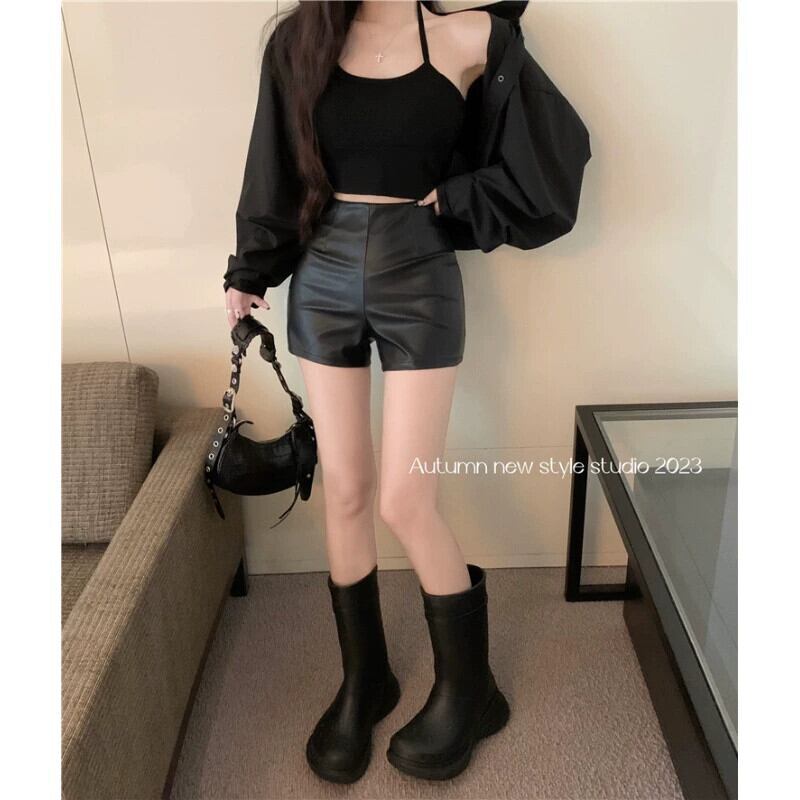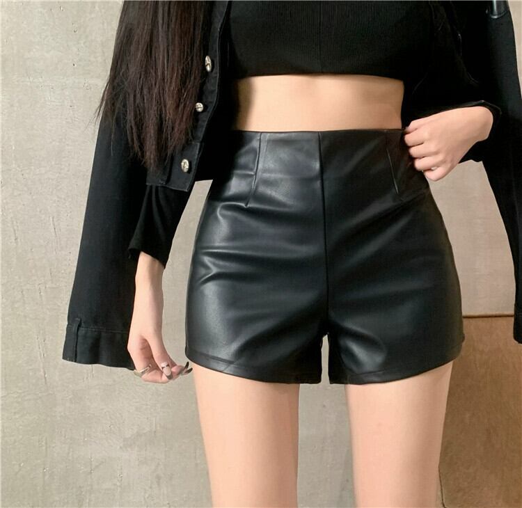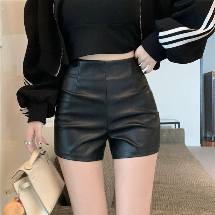 多用途ウエストスリム PU レザーショートパンツ女性の秋 2023 黒ヒップカバータイトなホットパンツトレンディ ブラック オータム 秋物 ショーツ ブルマー 0921920244252644