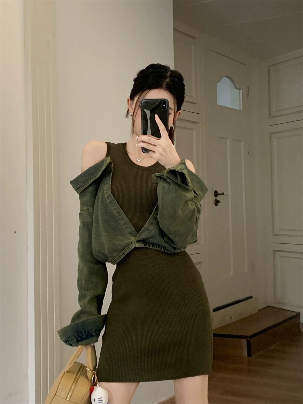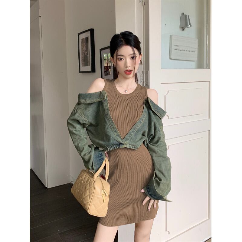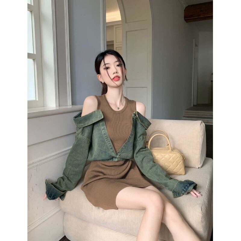 フェイクツーピースデニムスプライシングオフショルダー長袖ドレス秋デザインニッチスリムフィットヒップショートスカートの女性 ロング オータム 秋物 0921949182324270