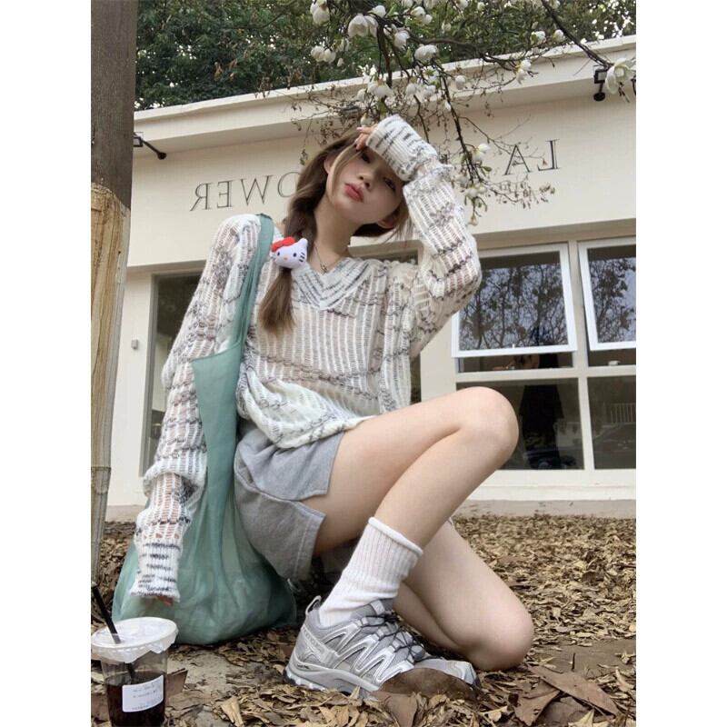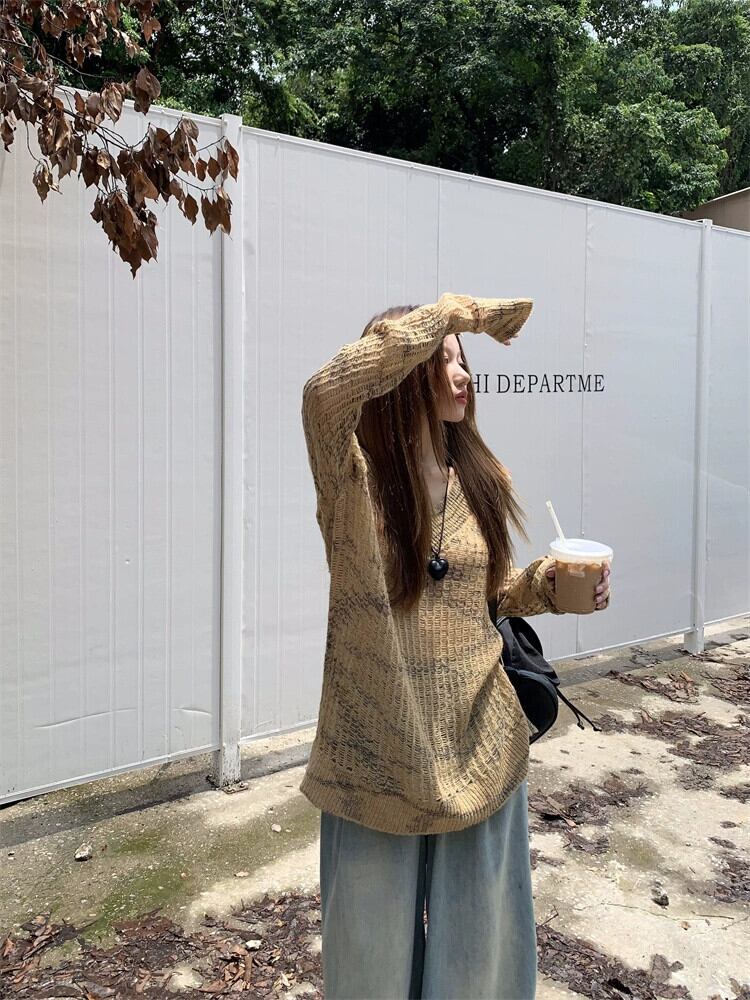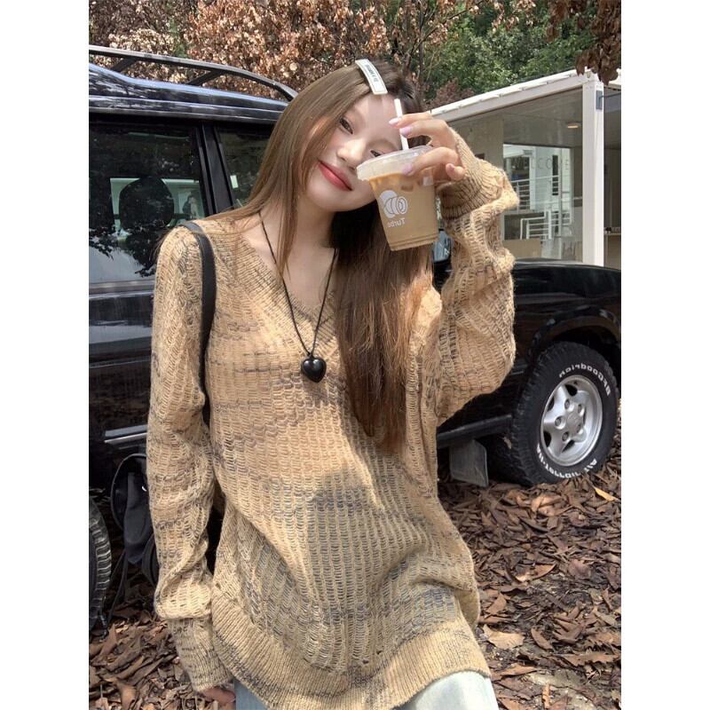 穏やかな気質 V ネック中空長袖セーター女性秋 2023 新しい緩い怠惰なスタイルプルオーバーセーターイン ロング オータム 秋物 Vネック 0921952926204460