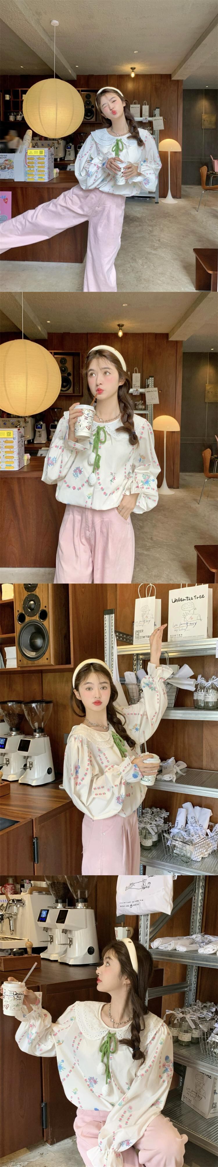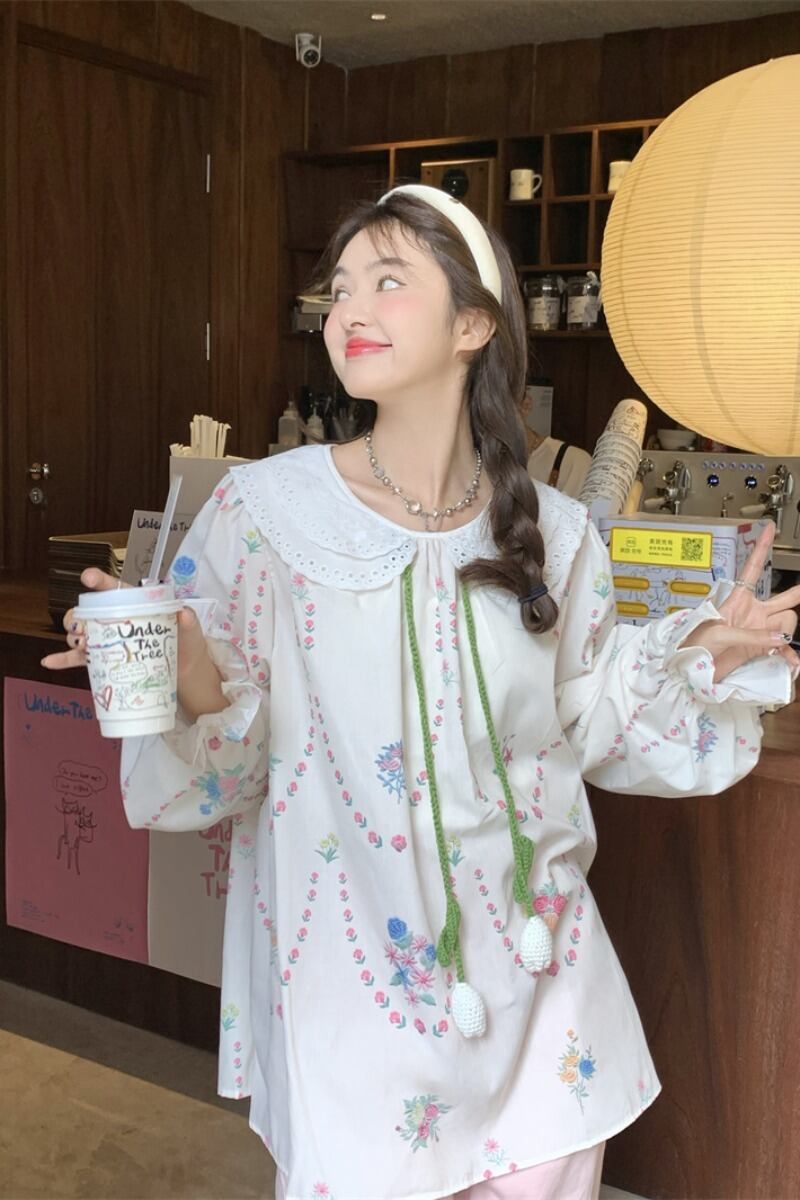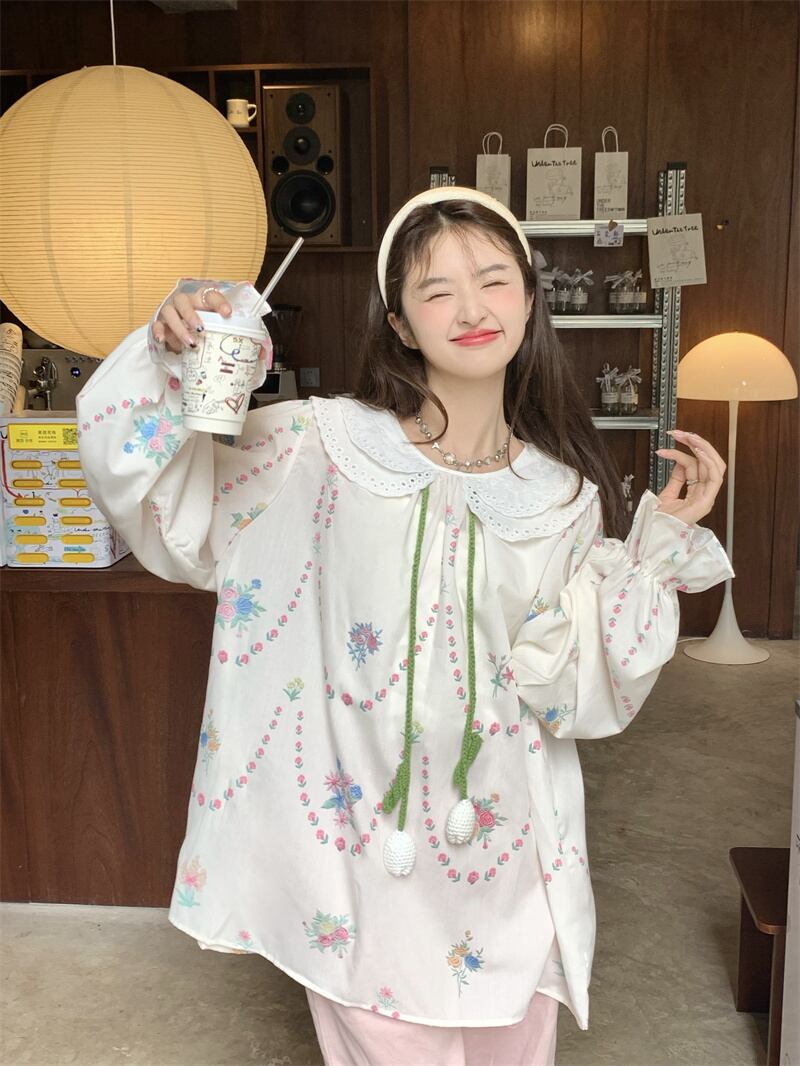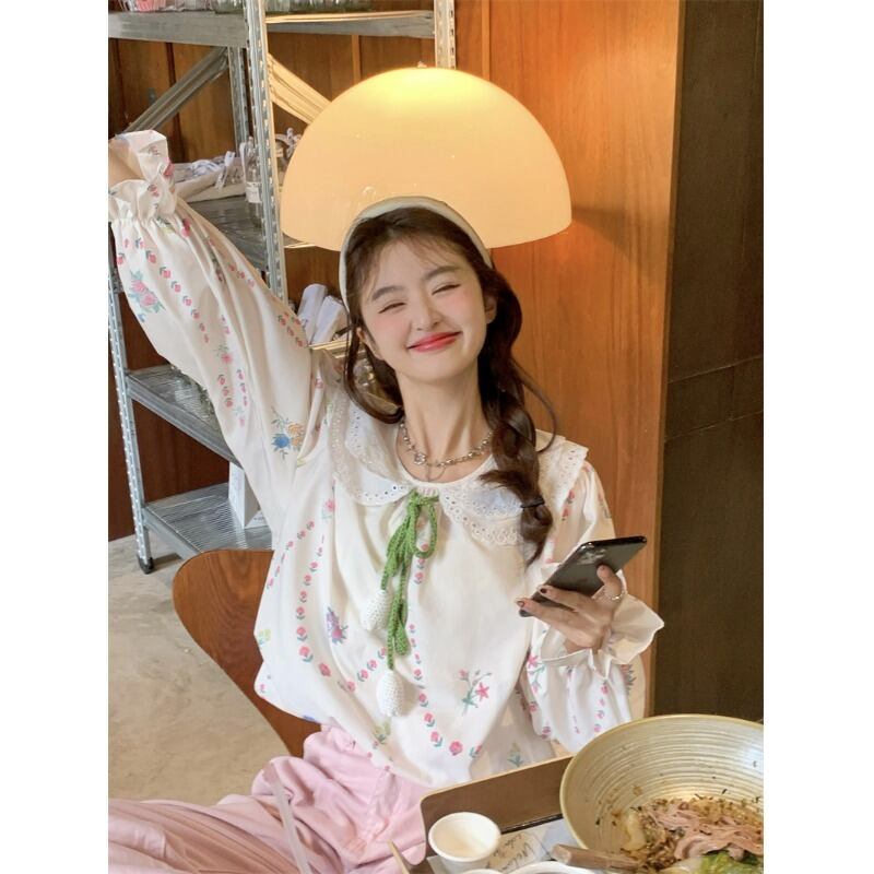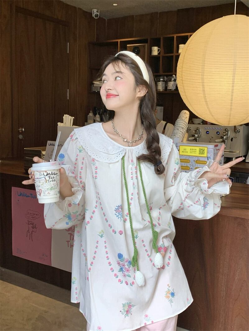 甘い老化人形の襟花柄長袖シャツ女性秋 2023 新しいスタイルのレースアップルーズスリムシャツ ロング 大人ガーリー スウィート キュート カジュアル オータム 秋物 0921970713152320