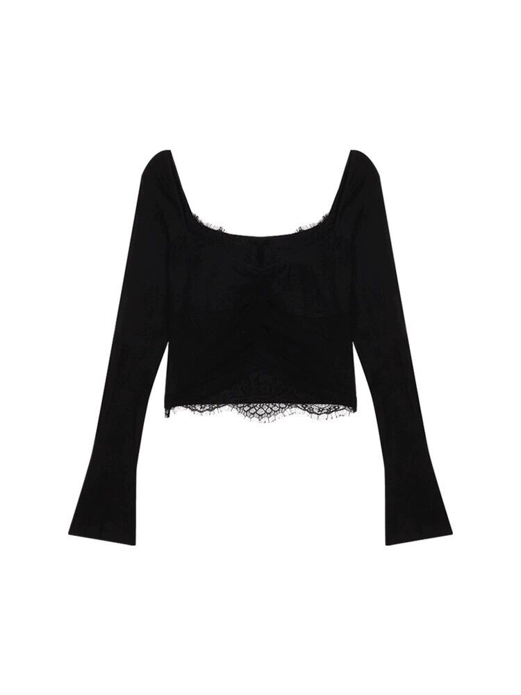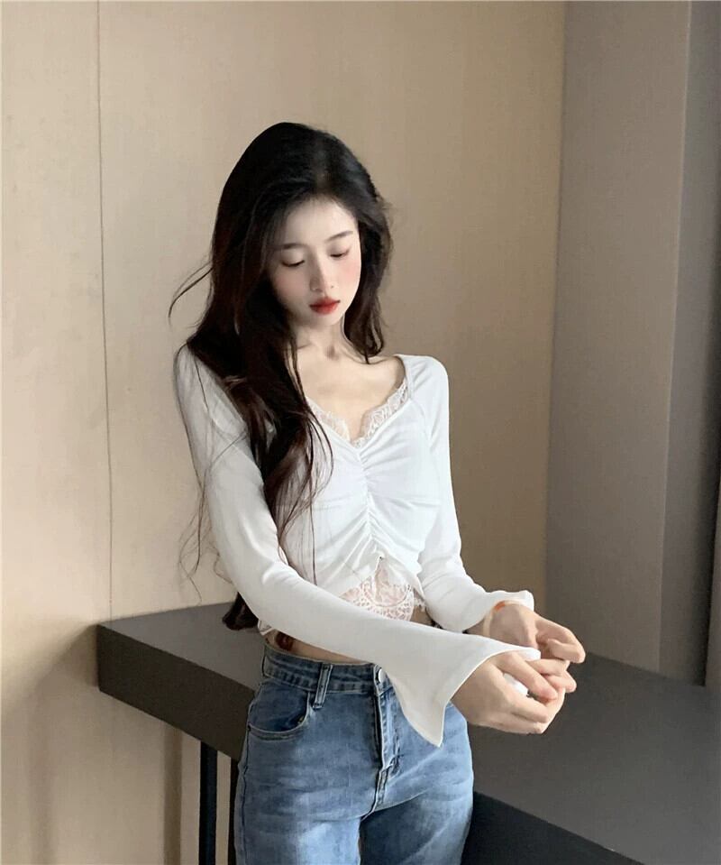 ホットホワイト V ネック長袖インナー Tシャツ女性の秋のセクシーなレースのスプライシングスリムショートボトシャツトップ ロング オータム 秋物 Vネック 092196640409392