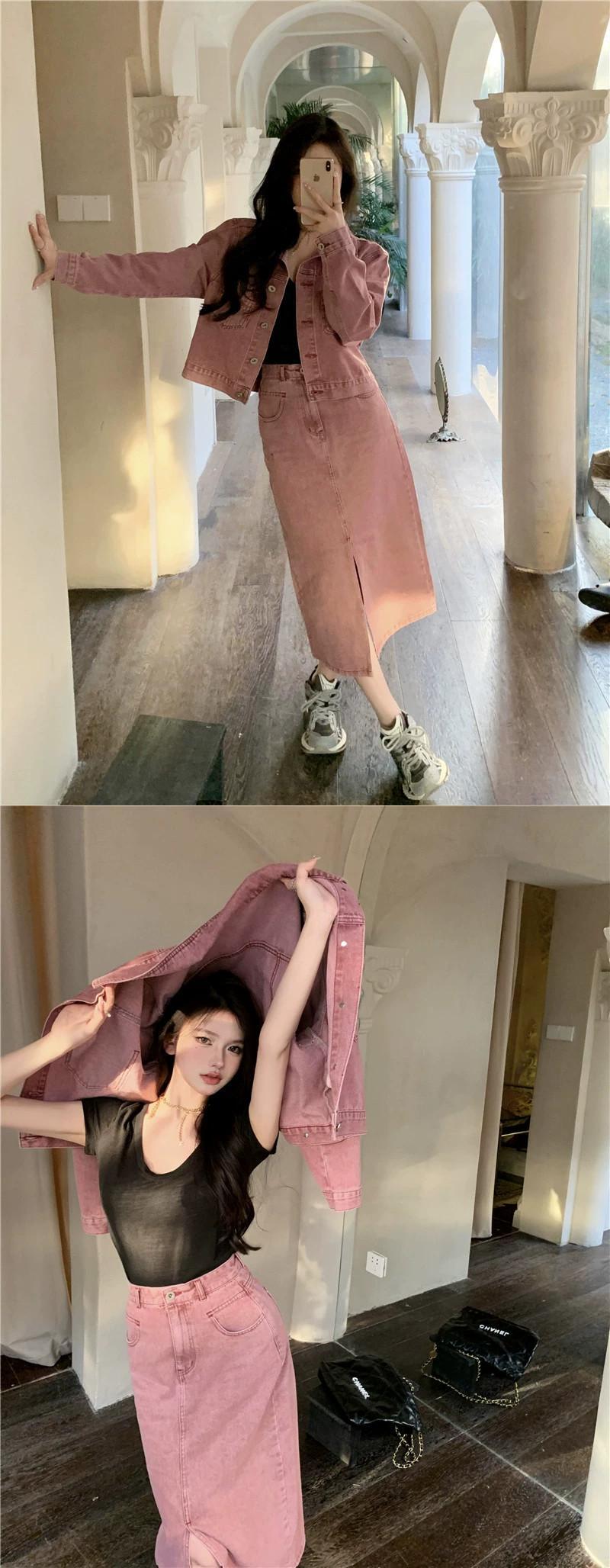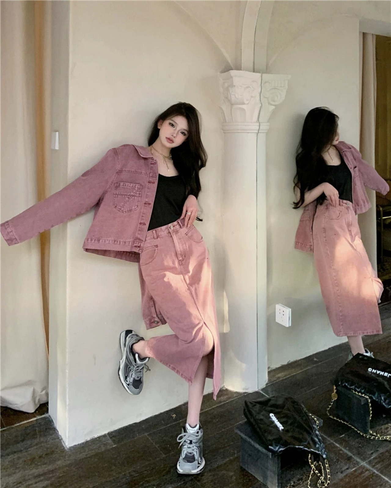 レトロな気質ピンクデニムスーツの女性の秋 2023 新しいルーズスリムコートスリットスカート 2 点セット オータム 秋物 0921933823991238