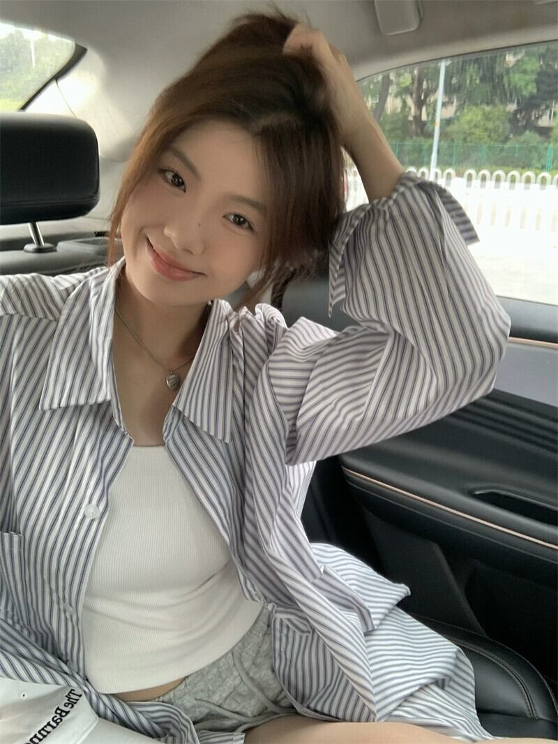 ニッチコントラストカラーストライプ長袖シャツ女性秋 2023 新しいポロカラー塩スタイル多目的ルーズシャツ ロング オータム 秋物 0921945140079436