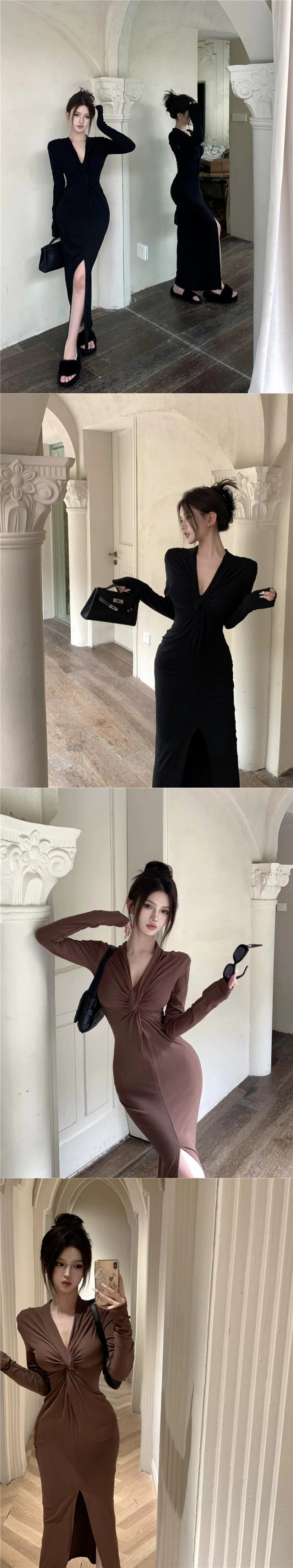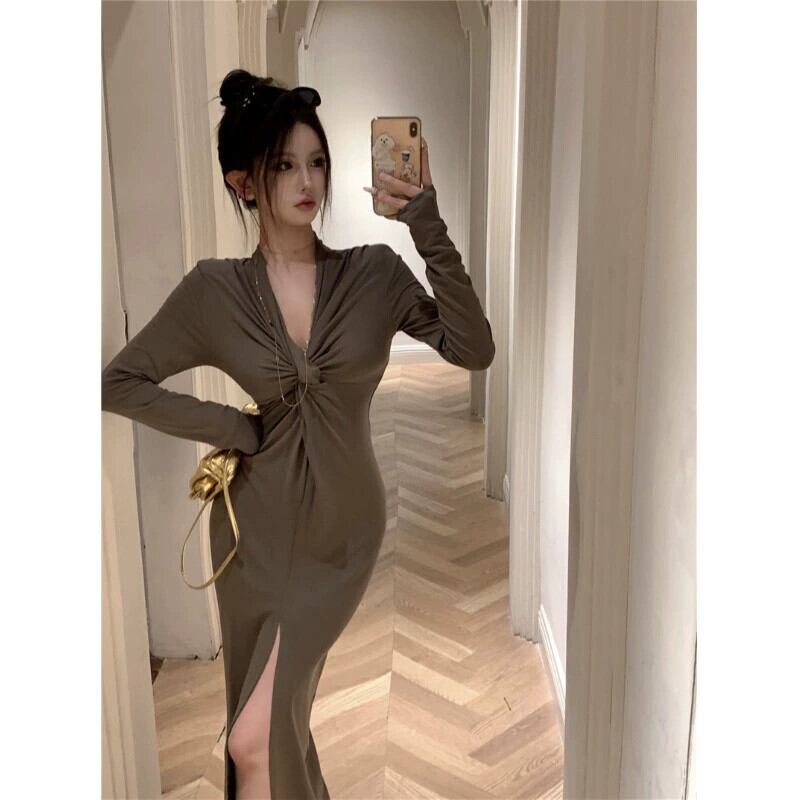気質ロイヤルシスタースタイルvネック長袖ドレスレディース秋インナースカートスリムフィットスリットセクシーなヒップカバーロングスカート オータム 秋物 0921977862579377