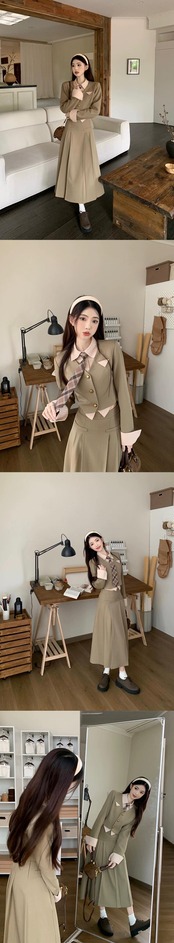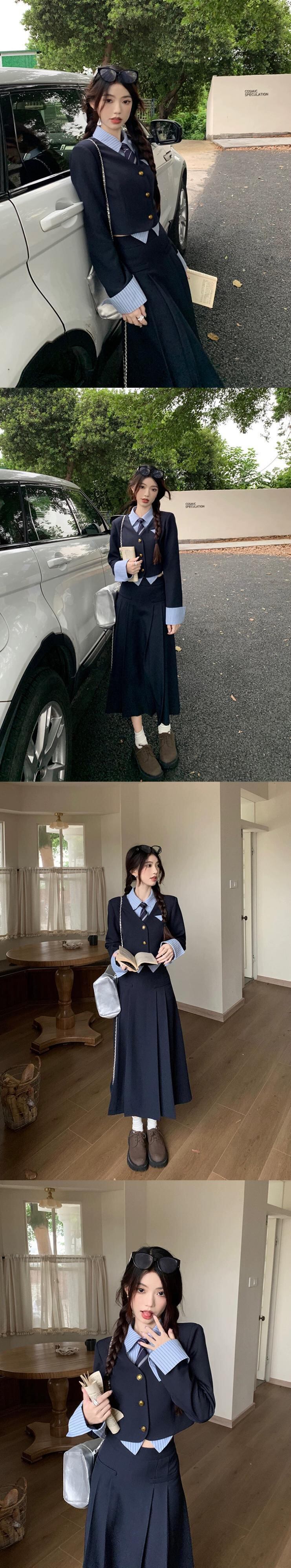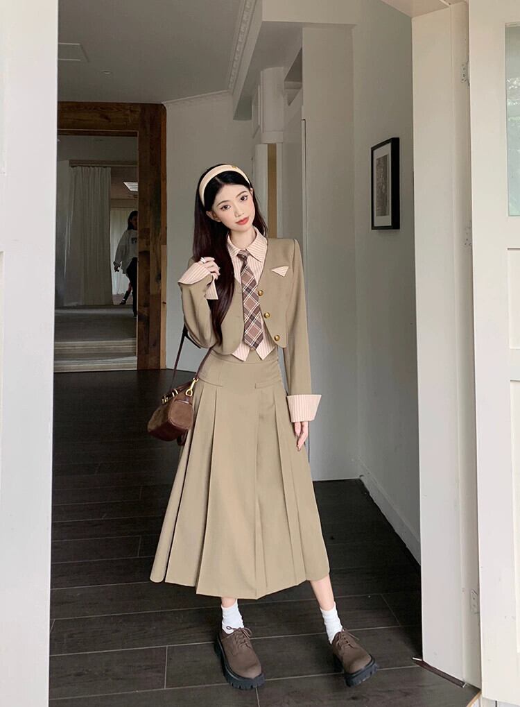 レトロカレッジスタイルフェイクツーピースショートスーツトップレディース秋スリムミドル丈スカート2点セット オータム 秋物 0921983470251248