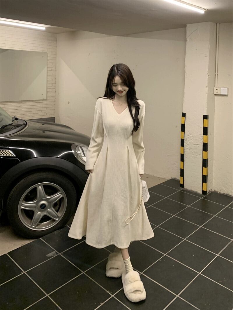 レトロフレンチ V ネック長袖ドレス女性秋 2023 新しい優しいスタイルウエスト痩身無地 A ラインロングスカート オータム 秋物 Vネック Aライン ソリッドカラー 0921911449763722