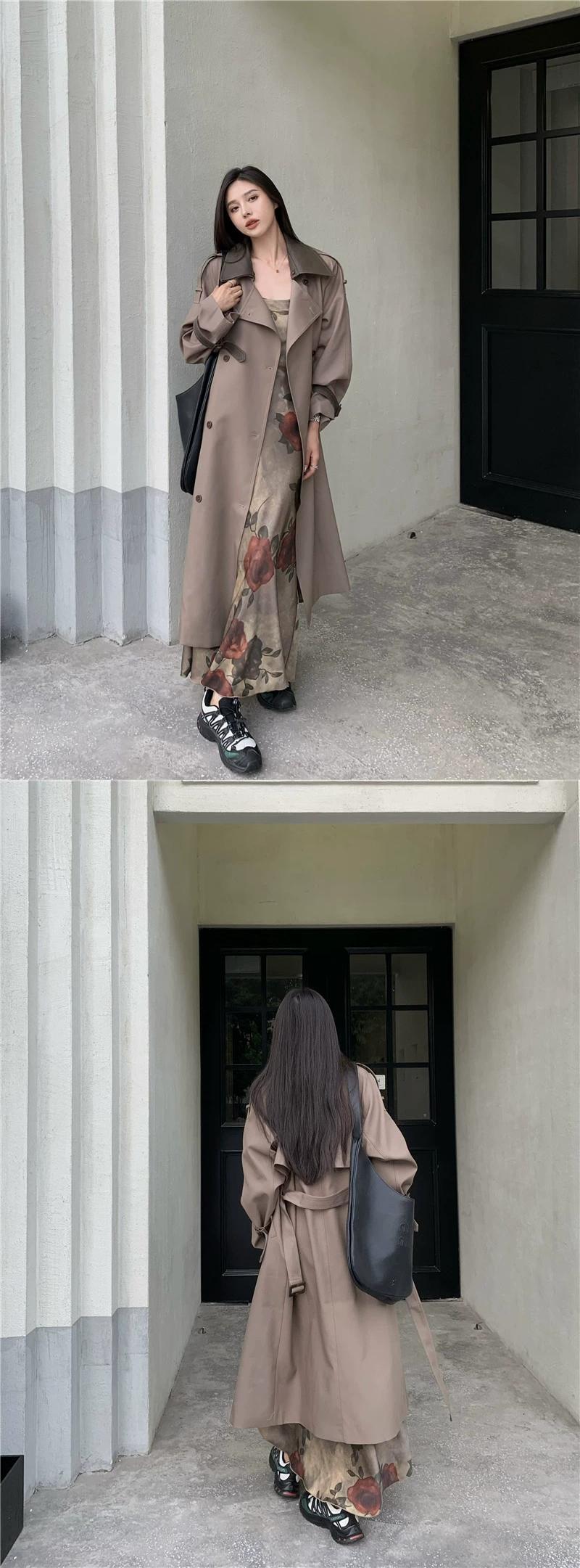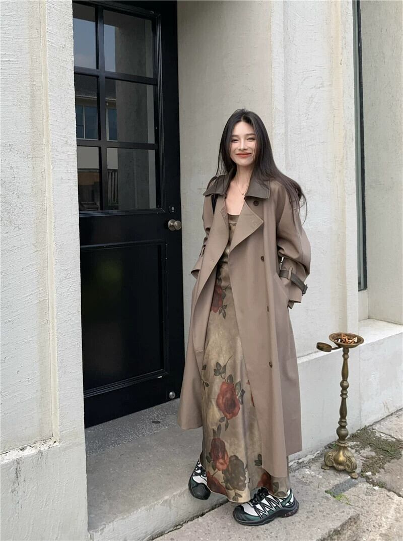 レトロ香港スタイル長袖ウインドブレーカーコート女性秋 2023 新スタイル取り外し可能な二層レザーカラーロングルーズコート オータム 秋物 0921960160930691