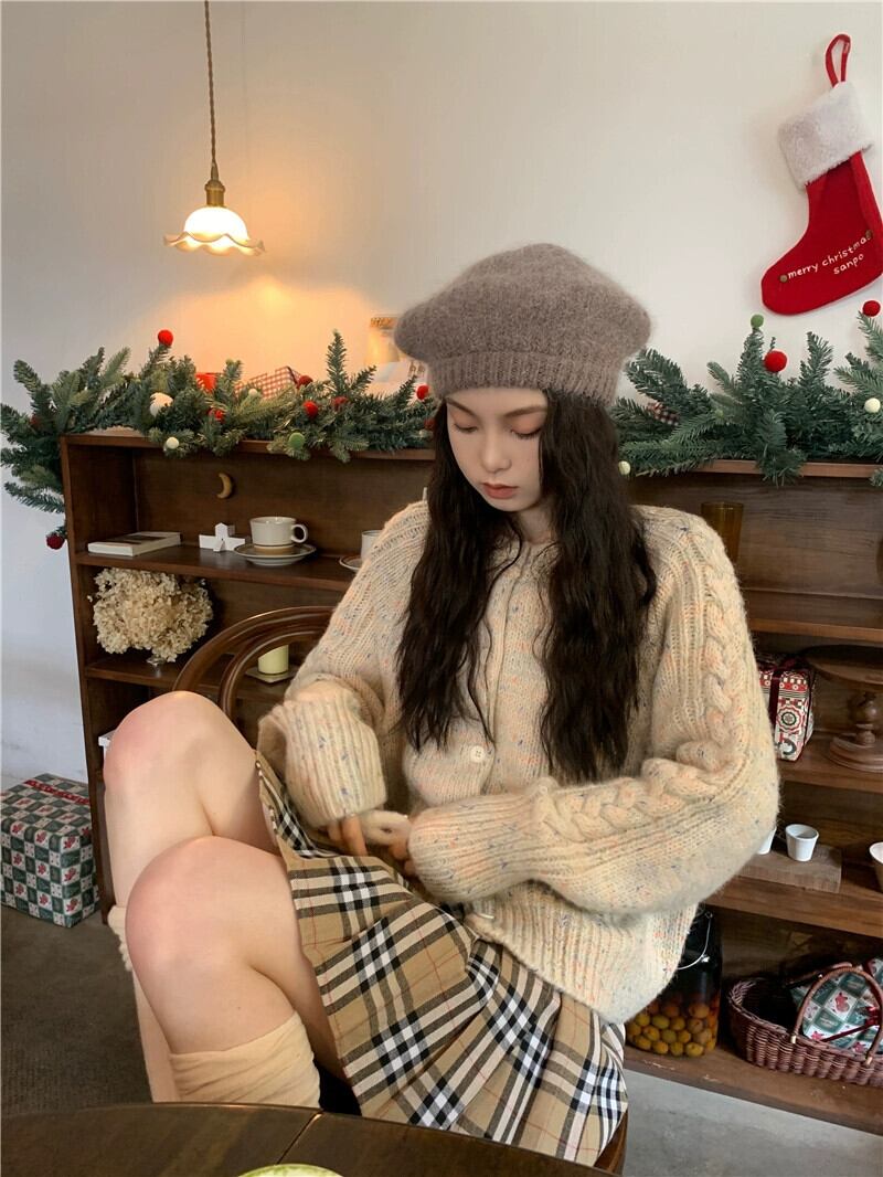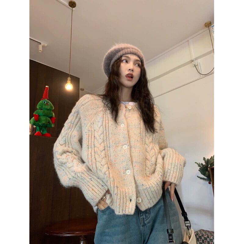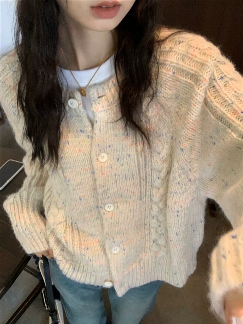 レトロなラウンドネック多彩なデザインツイストニットカーディガン女性の秋緩い怠惰なスタイル肥厚セータージャケット オータム 秋物 Oネック 092193467762350