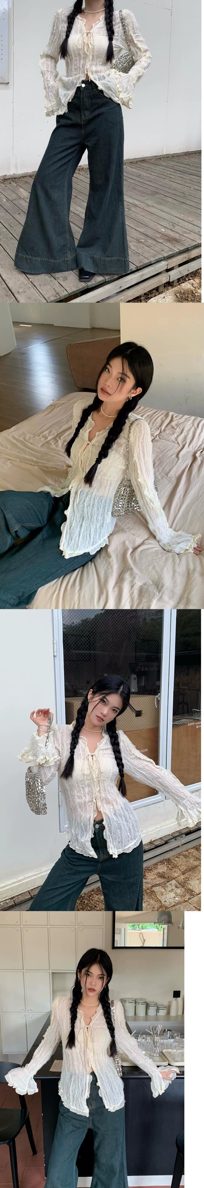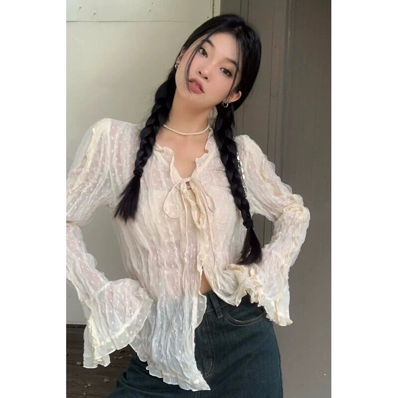 ニッチ V ネック レース シャツ レディース 2023 秋新作トランペット長袖プリーツ スリム レースアップ トップ ロング オータム 秋物 Vネック 0921955552077837