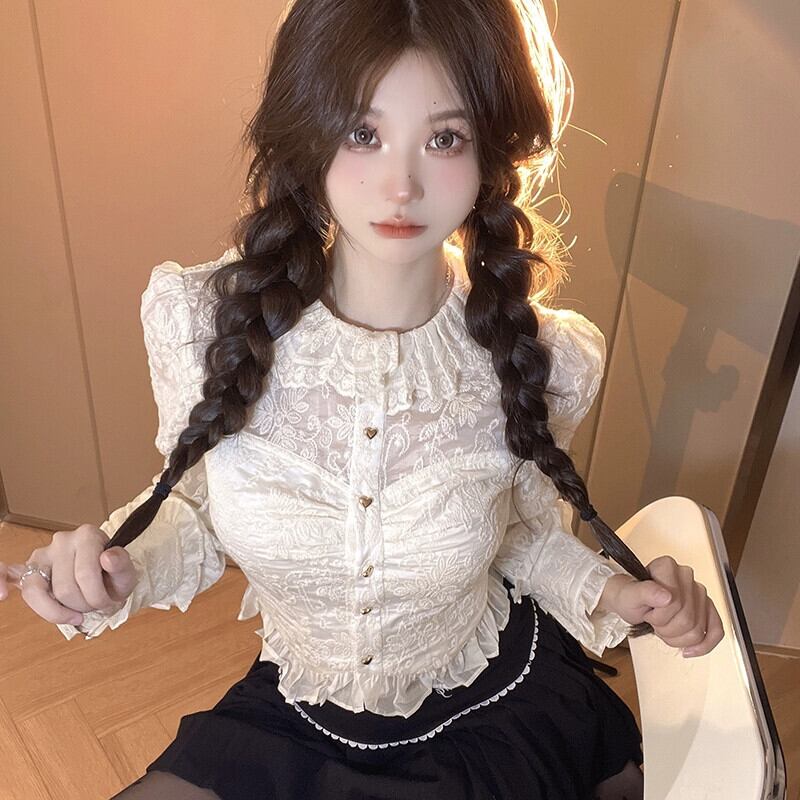 フランス宮殿スタイル長袖スプライスレースシャツ女性の秋 2023 甘いレーススリムフィットシャツ ロング 大人ガーリー スウィート キュート カジュアル オータム 秋物 0921976292153110