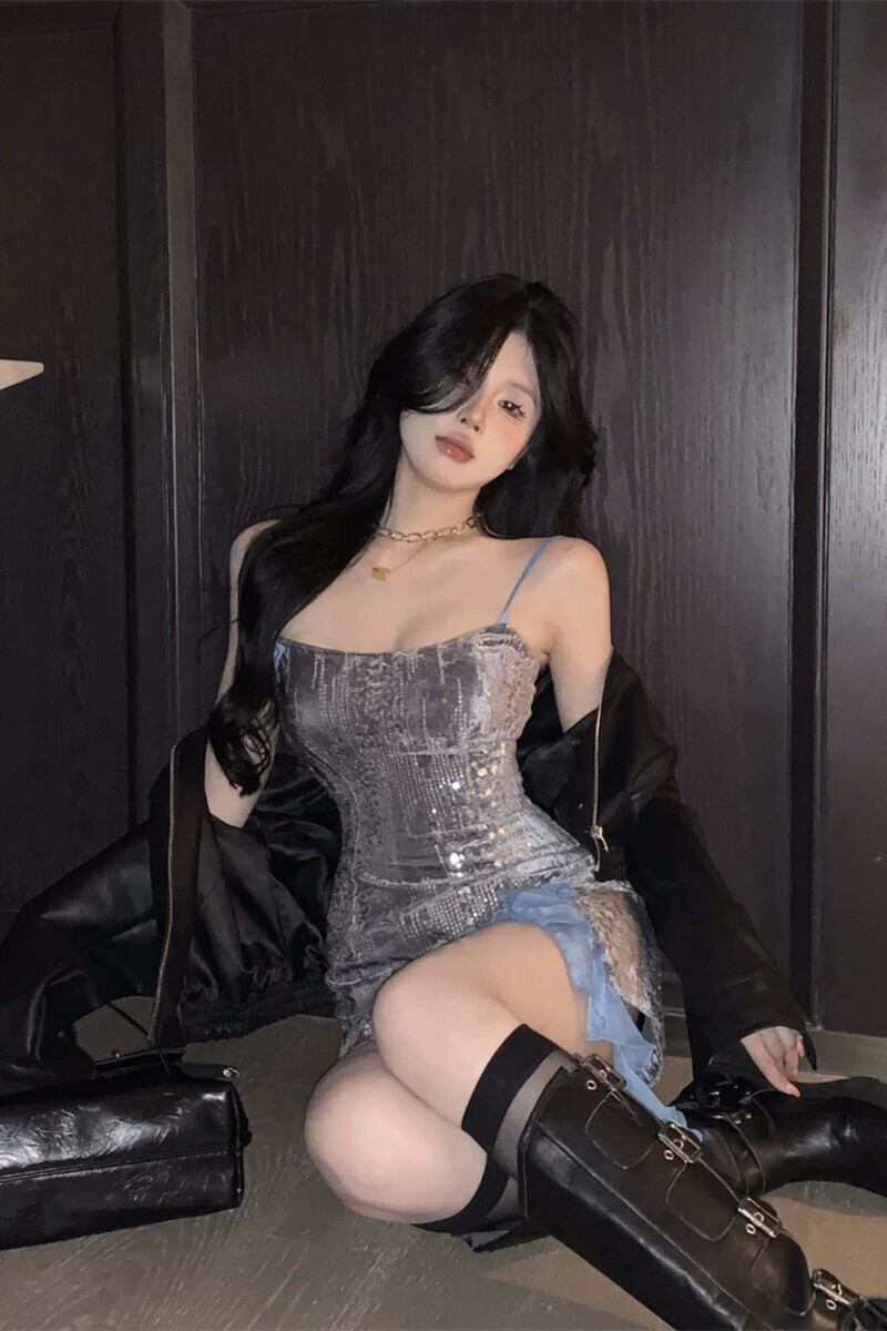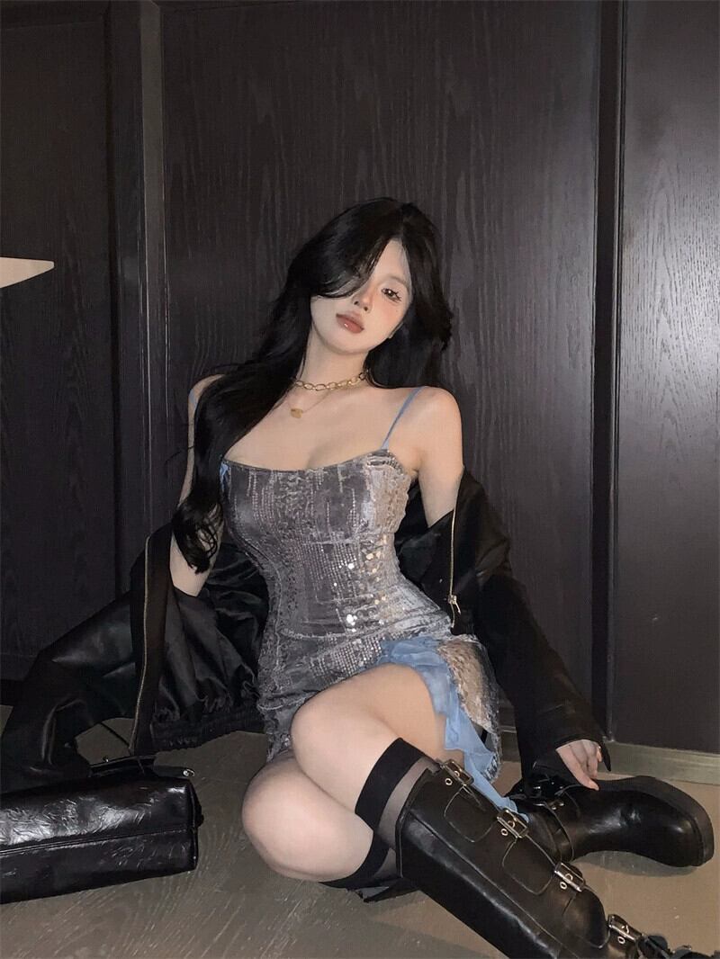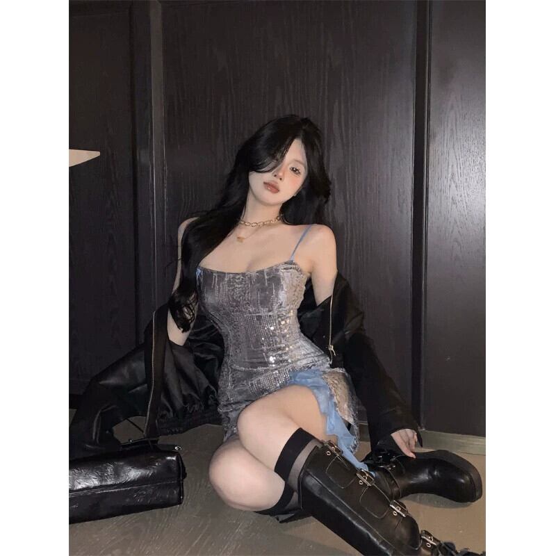 セクシーなホットガール スパンコール サスペンダー ドレス レディース 初秋 2023 スタイル スリム フィット ショート A ライン スカート オータム 秋物 Aライン 0921987197949107