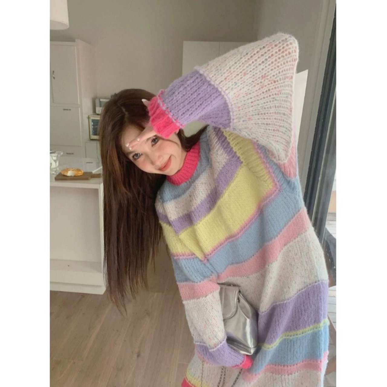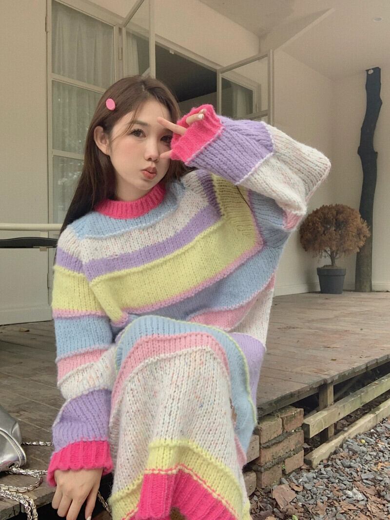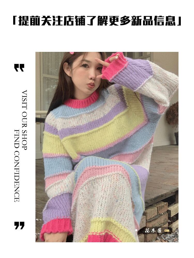 甘いレインボーストライプ長袖ドレスの女性の秋 2023 新しいソフトで怠惰なスタイルのルーズでスリムなセータードレス ロング 大人ガーリー スウィート キュート カジュアル オータム 秋物 0921915328079802