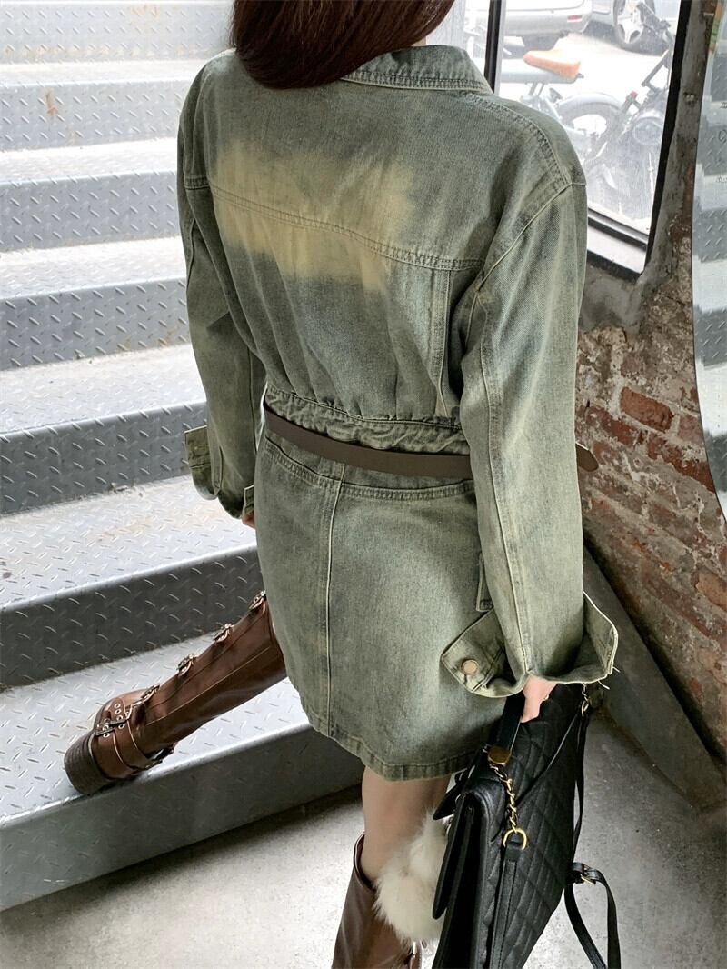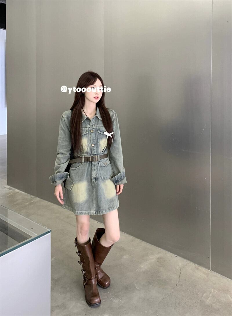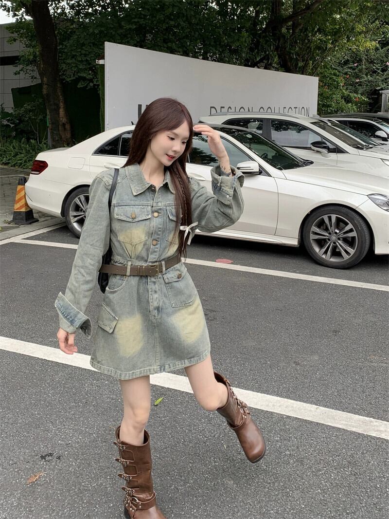 香港スタイルのレトロな長袖デニムドレス女性秋 2023 新ファッションポロ襟ウエスト痩身 A ラインスカート ロング オータム 秋物 Aライン 092193146531719