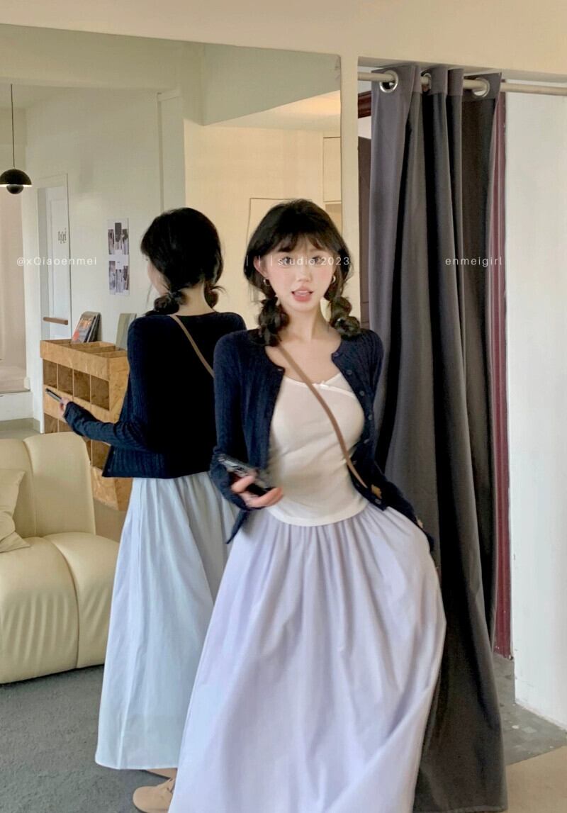 色:ツイストカーディガン,ボウホワイトT,ブルーパープルスカート