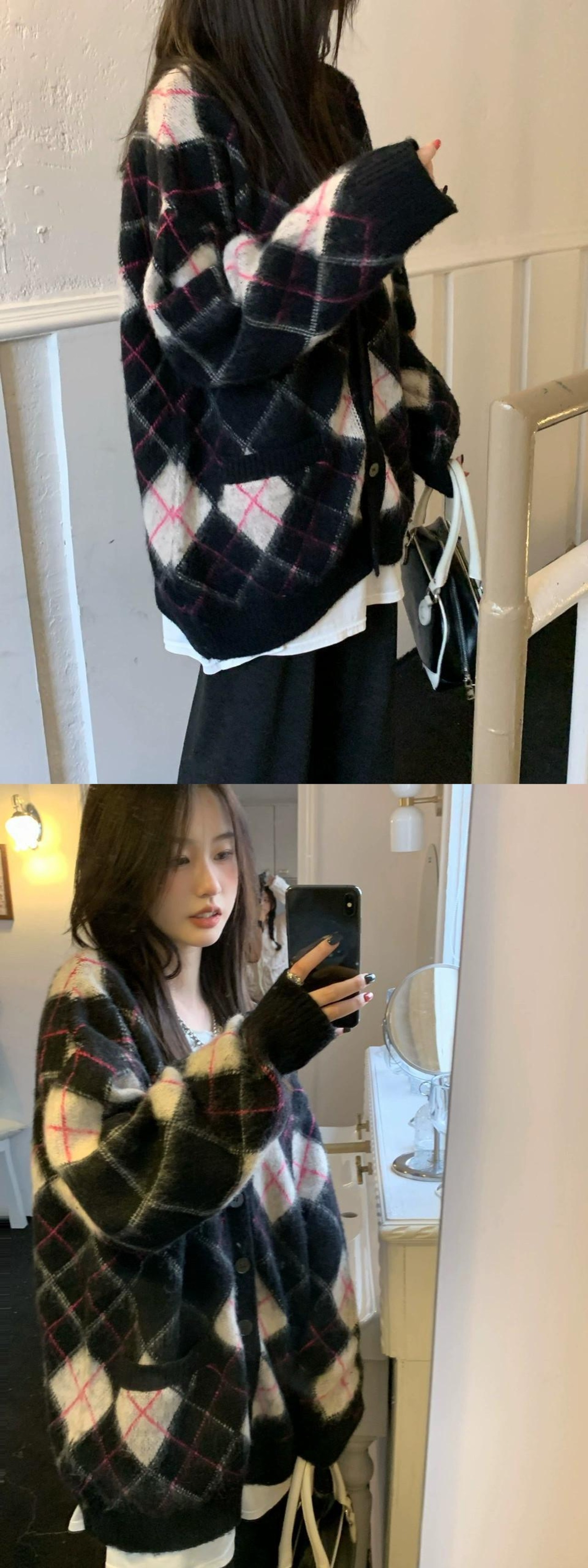 レトロ怠惰なダイヤモンドパターン長袖セータージャケット女性秋 2023 新しいルーズ V ネックスリムカーディガントップ ロング オータム 秋物 Vネック 0921993227260031