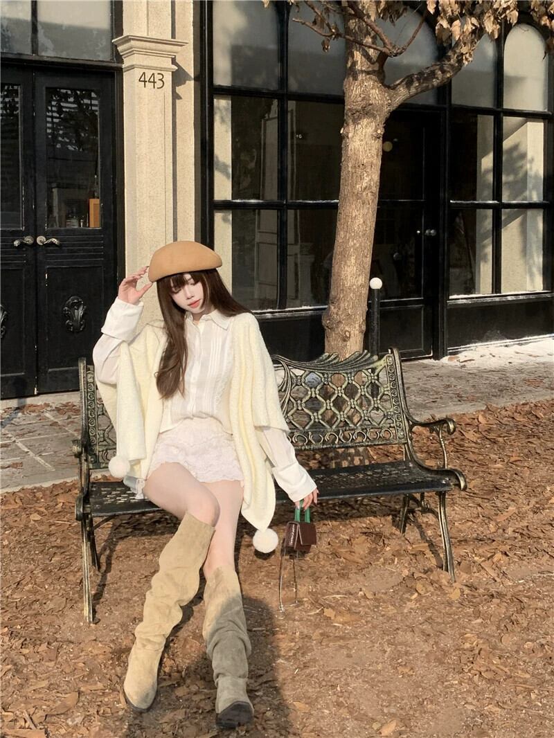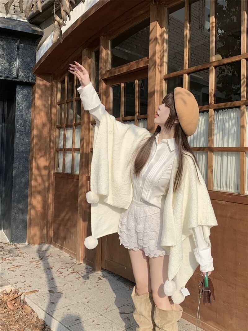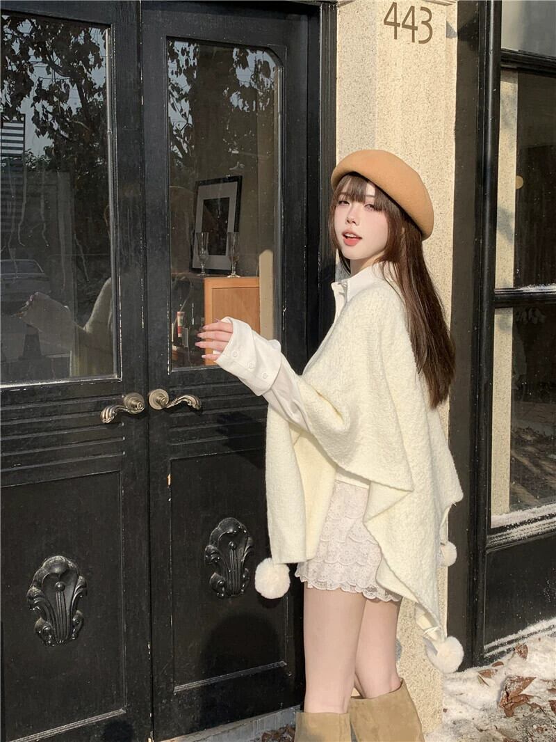 柔らかく優しいスタイルの無地セーターショール女性の2023年秋の新デザインファーボールケープジャケット オータム 秋物 ソリッドカラー 0921979995479701