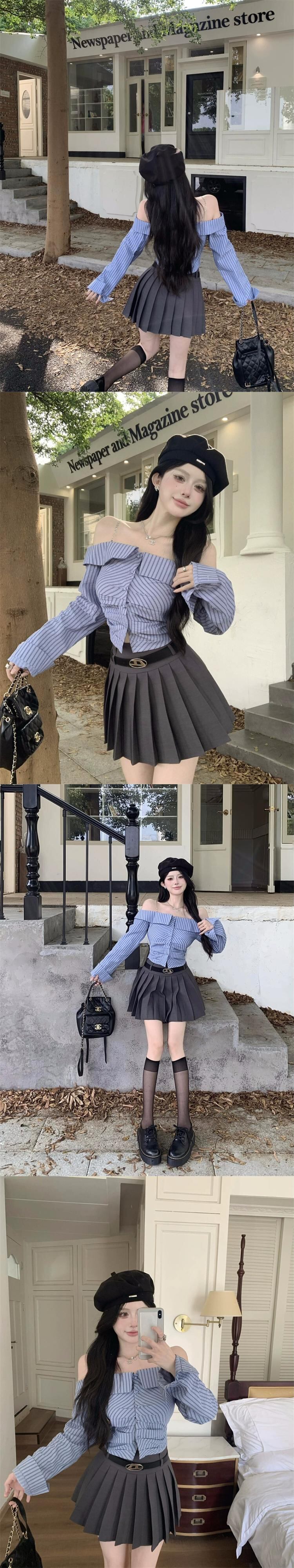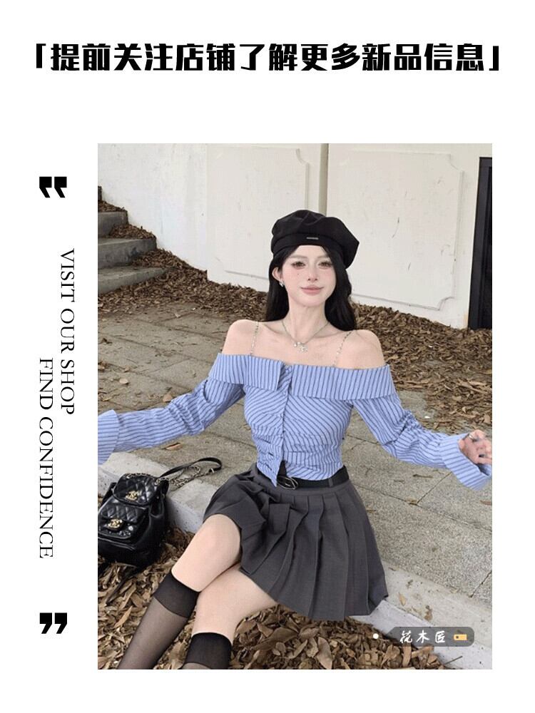 ホットファッションスーツスカート女性の秋 2023 新しいオフショルダーボタン付きサスペンダーシャツスリムプリーツスカート 2 点セット オータム 秋物 0921984643920875