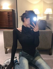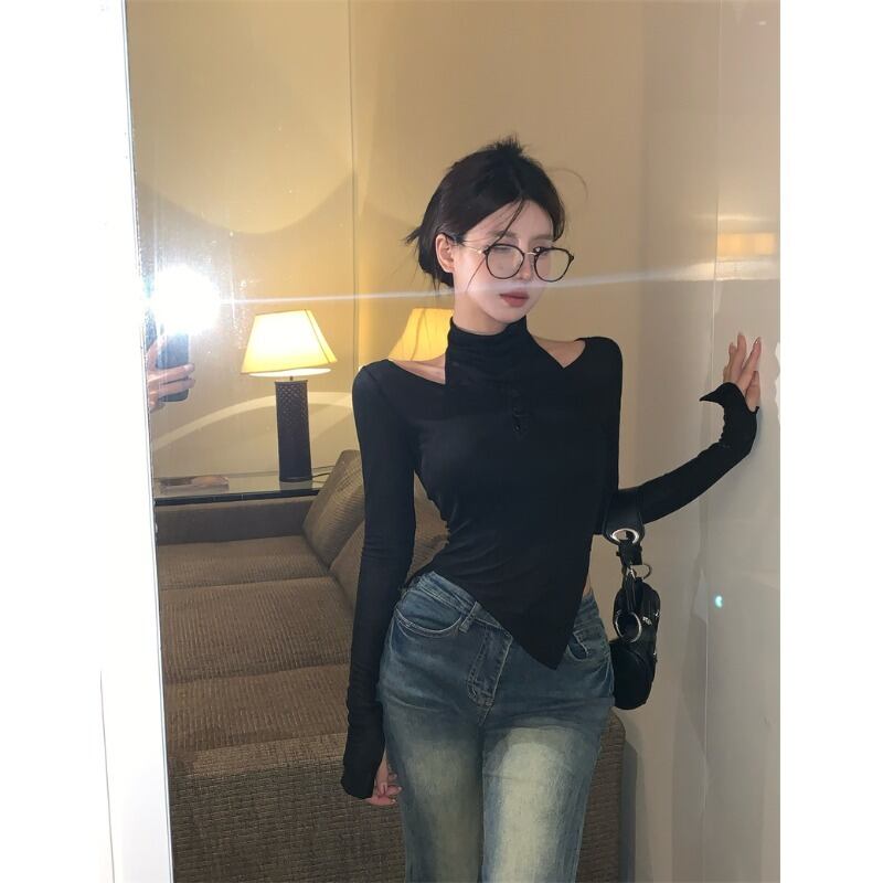 不規則なハーフハイカラーオフショルダー長袖Tシャツ女性初秋2023新しいスタイルの気質ショートスリムスリムトップトレンディ ロング オータム 秋物 0921924571421000