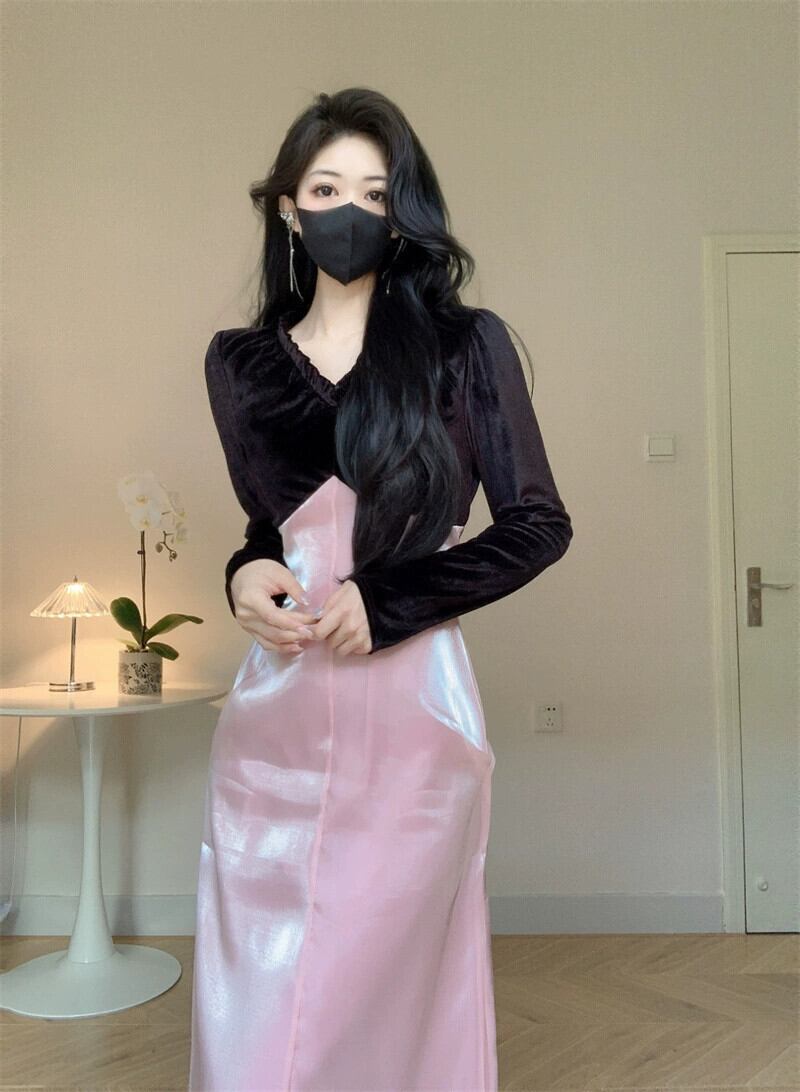 エドベルベットスプライシングvネック長袖ドレス女性初秋2023新しいスリムフィットミッドレングススカート ロング オータム 秋物 0921996504180446