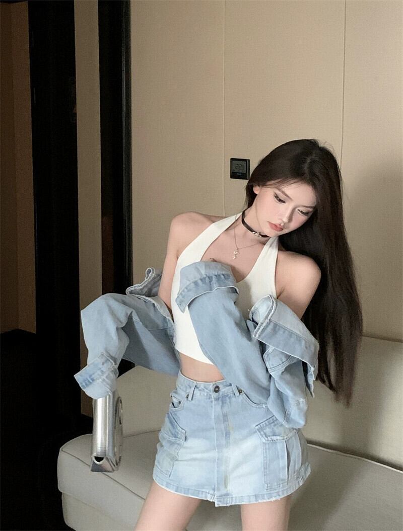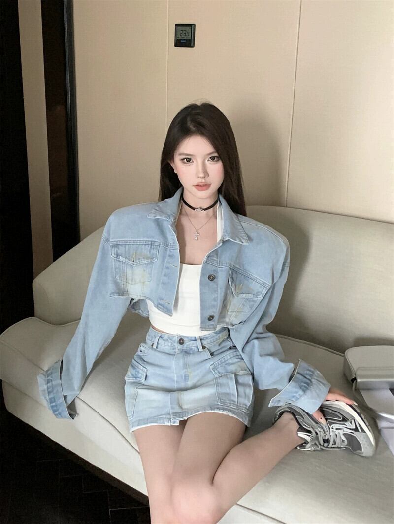 レトロなスタイルのデニムスーツの女性の秋 2023 新しいショートジャケットコートハイウエストスカート 2 点セット ハイウェスト オータム 秋物 092196486453508