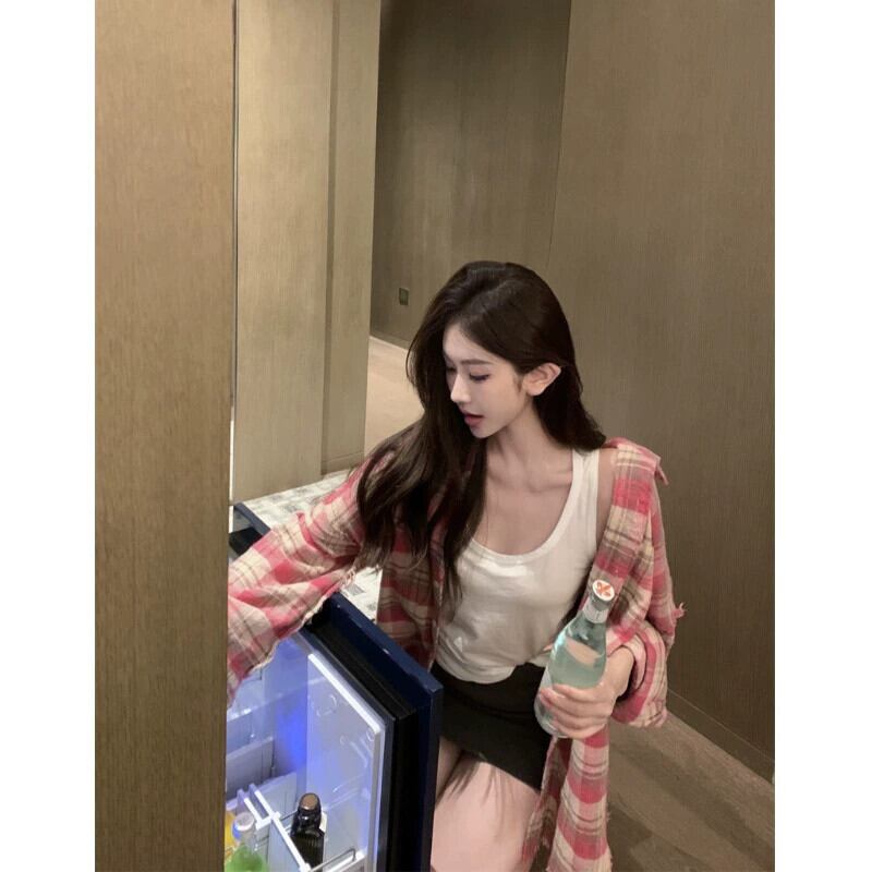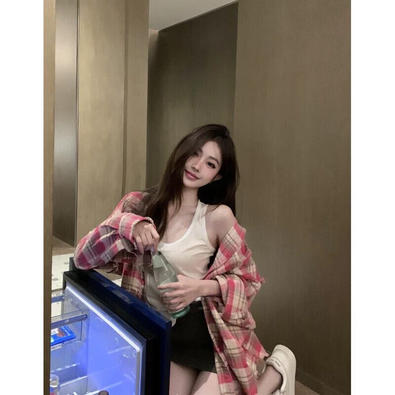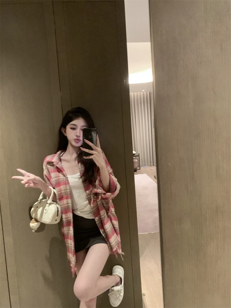 甘いクールなスタイルの起毛フリンジ長袖シャツ女性の 2023 秋の新コントラストカラーピンクのチェック柄怠惰なスタイルのルーズカーディガン ロング 大人ガーリー スウィート キュート カジュアル オータム 秋物 0921983172706028