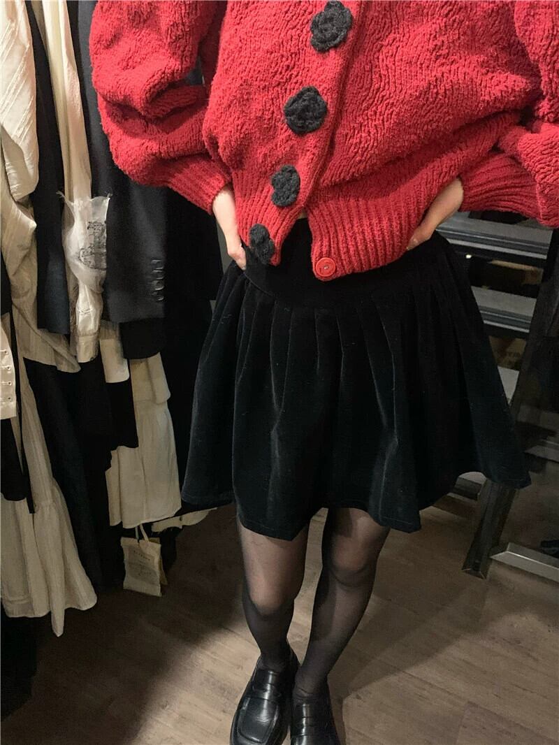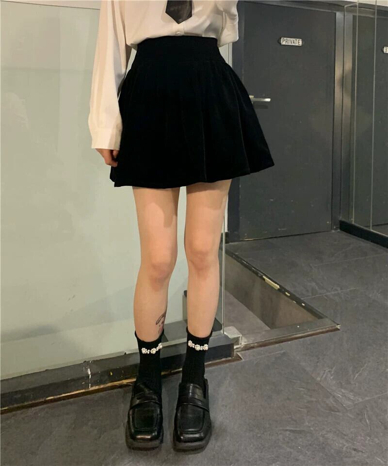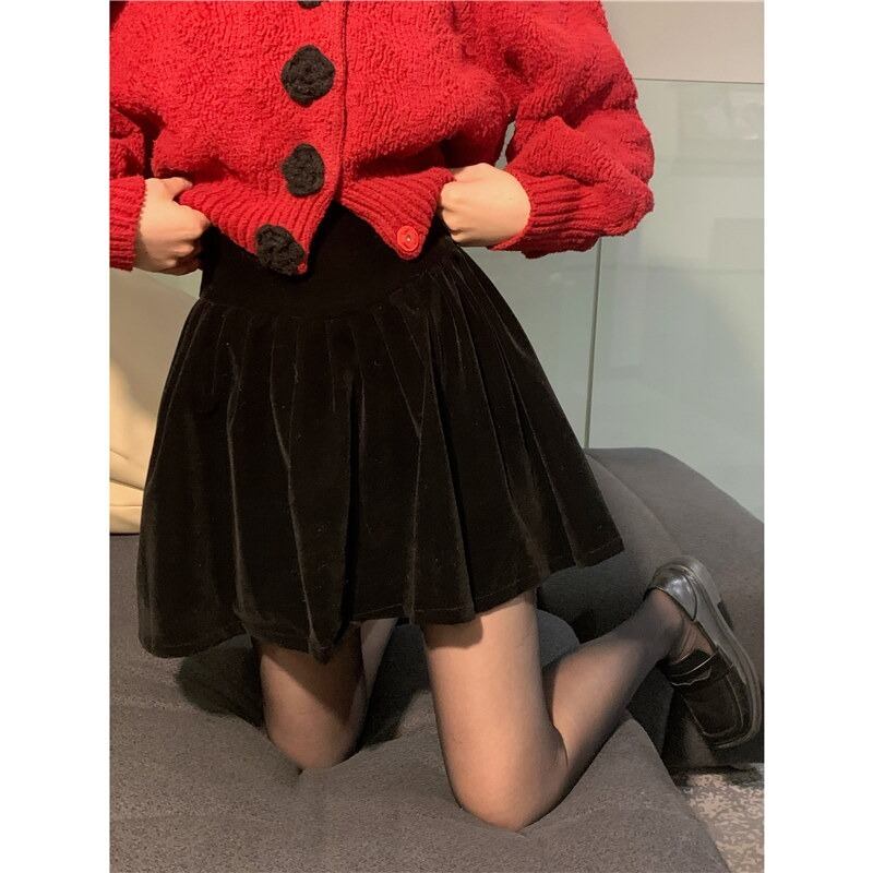 レトロな年齢を軽減する黒のベルベットのハイウエストスカート女性 2023 秋の新しいスリムで多用途な A ラインプリーツスカート ブラック オータム 秋物 Aライン 0921941505423287