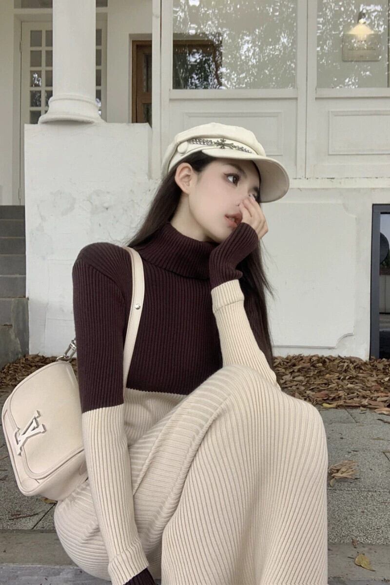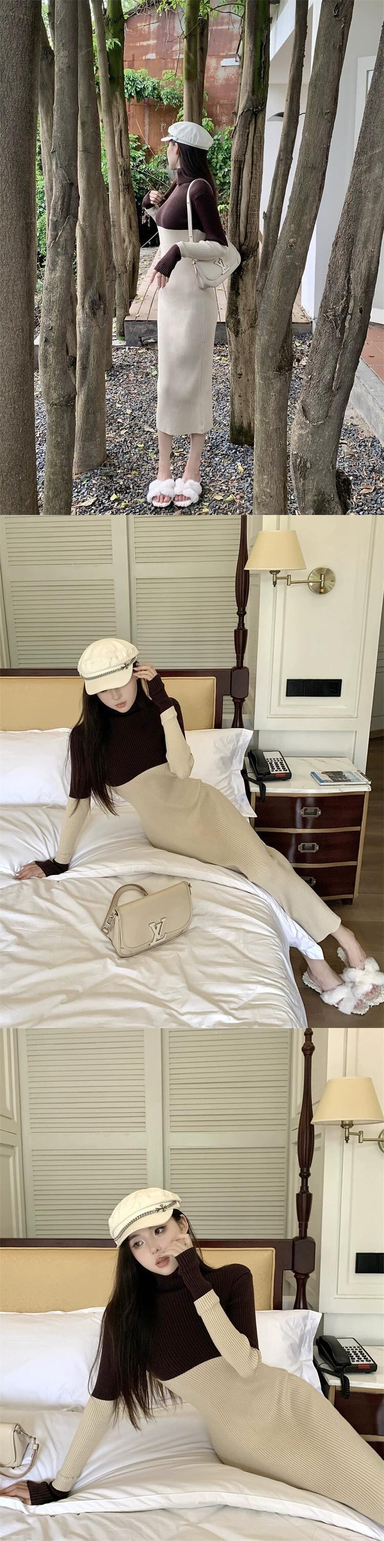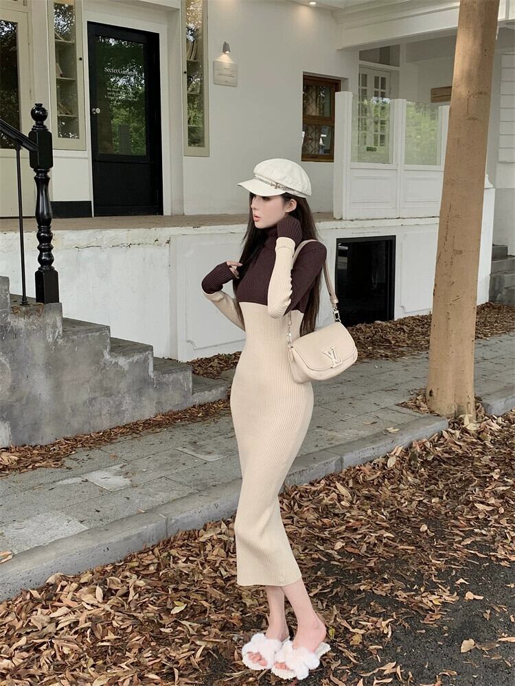 レトロなスタイルのハイネックコントラストカラー長袖ドレスの女性の秋 2023 新しいセクシーな腰カバーヒップニットスカート ロング オータム 秋物 0921916832356406
