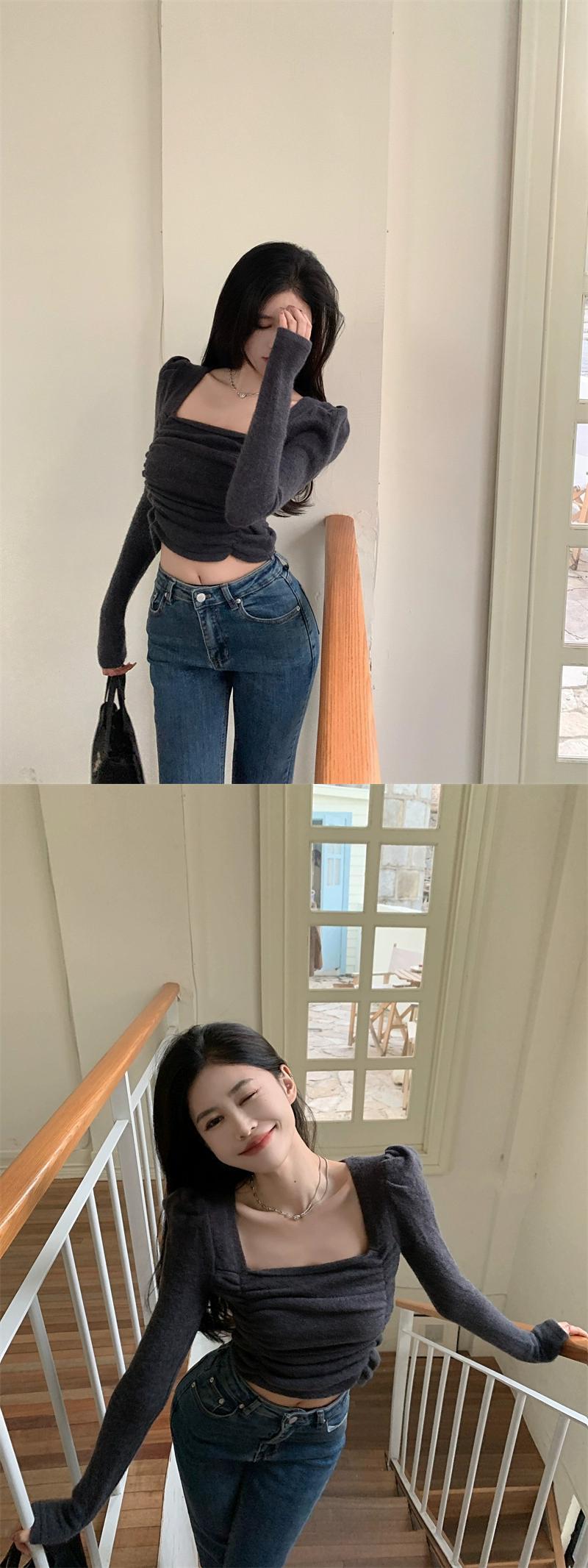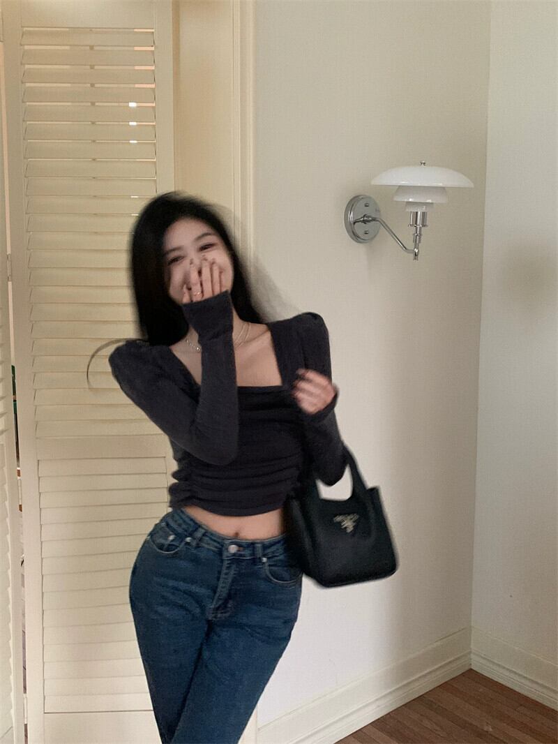 スタイル気質スクエアネックプリーツセーター女性初秋 2023 新しいショートセータースリムフィットプルオーバートップ オータム 秋物 スクウェア 0921910145878095