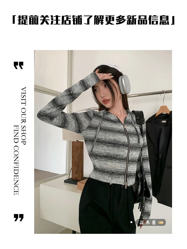 レトロな対照的なストライプのフード付きニットカーディガン女性初秋 2023 新しいショートセータースリムスリムトップトレンディな オータム 秋物 0921945879494843