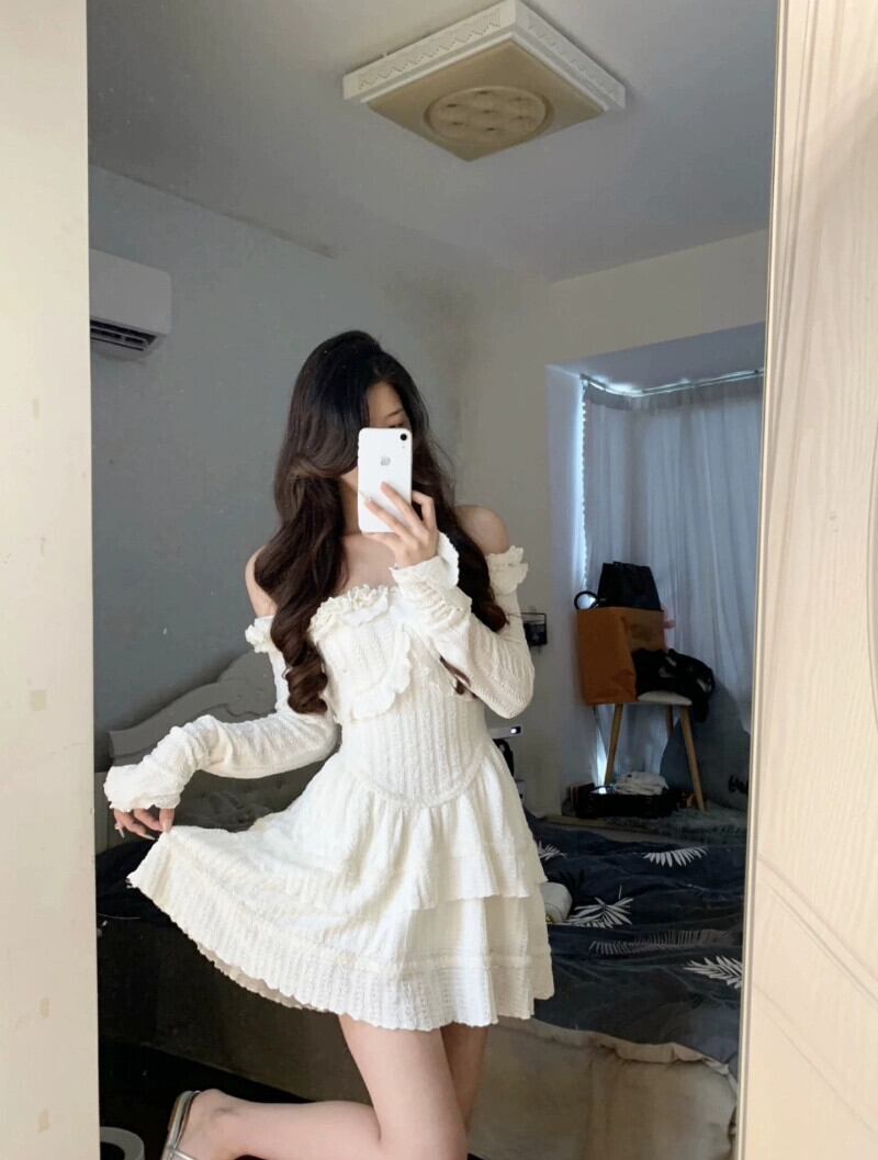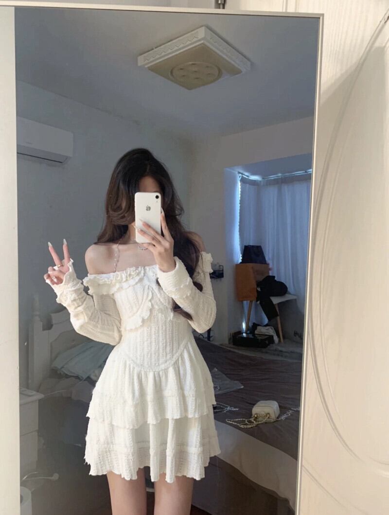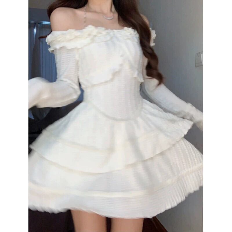 フレンチスイートスタイルワンショルダードレスレディース秋長袖ウエストスカートフリルニッチAラインスカート ロング 大人ガーリー スウィート キュート カジュアル オータム 秋物 092198272335386
